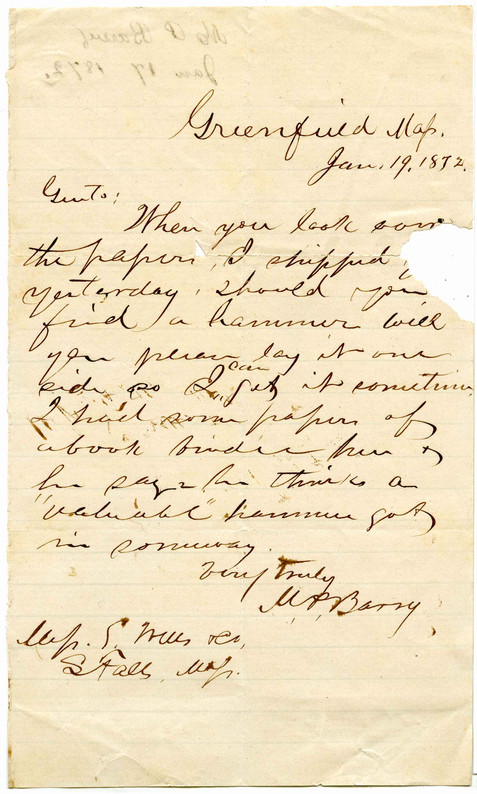 letter; Barry, M. P. - Business information - Greenfield, Ma.