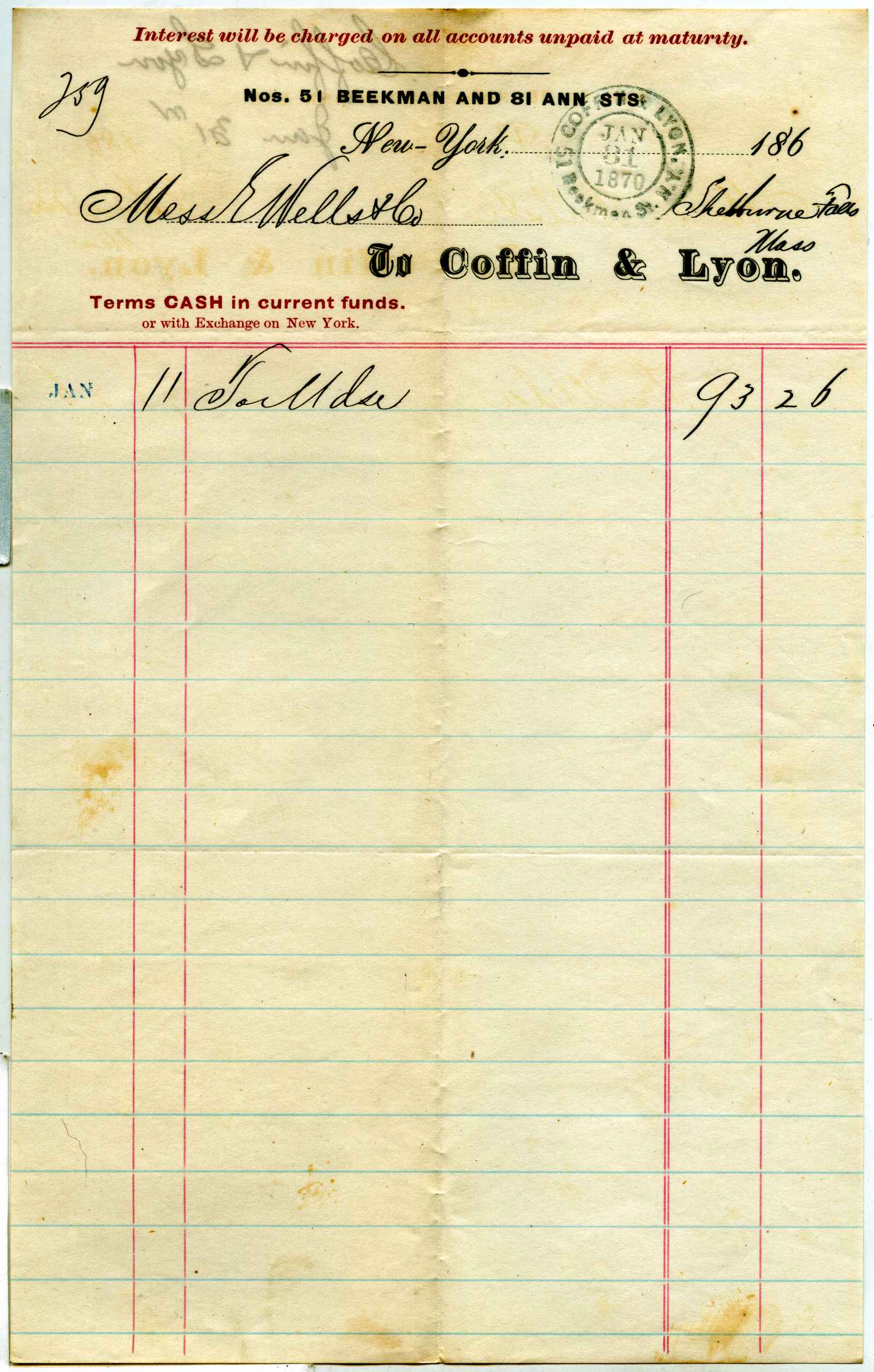 invoice; Coffin & Lyon - €” Wholesale Paper Warehouse - N. Y.