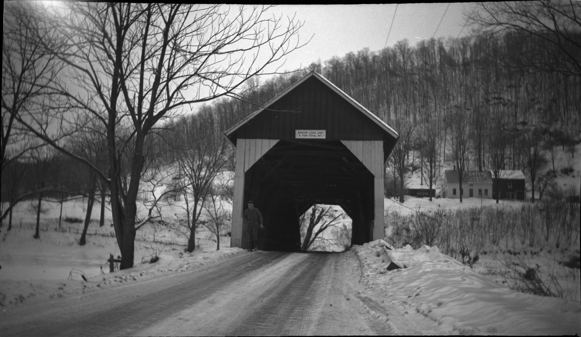 The Arthur A. Smith covered bridge (named after a resident Civil War Army captain) was the only surviving covered bridge in Colrain after the 1938 flood. This photo was probably taken in 1939. This bridge was originally built in in 1870, and moved to its present Lyonsville road location in 1886. The roof covering was added in the 1890s.