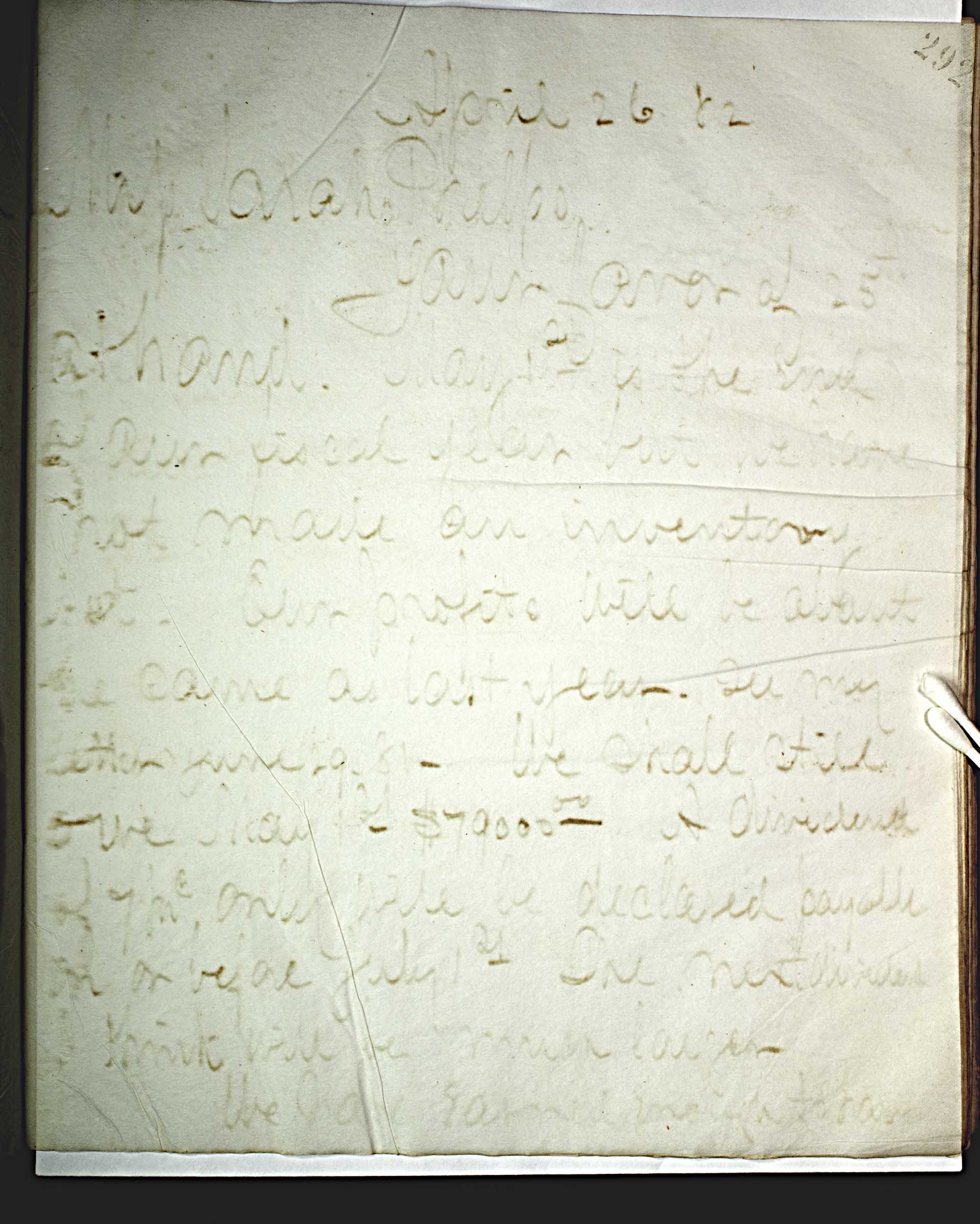 April 26, 82 [1882] -- Mrs. Sarah Phelps, -- Your favor of 25th at hand. May 1 -- st -- is the end of our fiscal year but we have not made an inventory yet. Our profit will be about the same as last year. See my letter June 29, 81 – We shall still [owe] May 1st $70000.00 -- A dividend of 7 -- prc -- only will be declared payable on or before July 1 -- st -- The next dividend I think will be much lower. -- We have earned much to have --