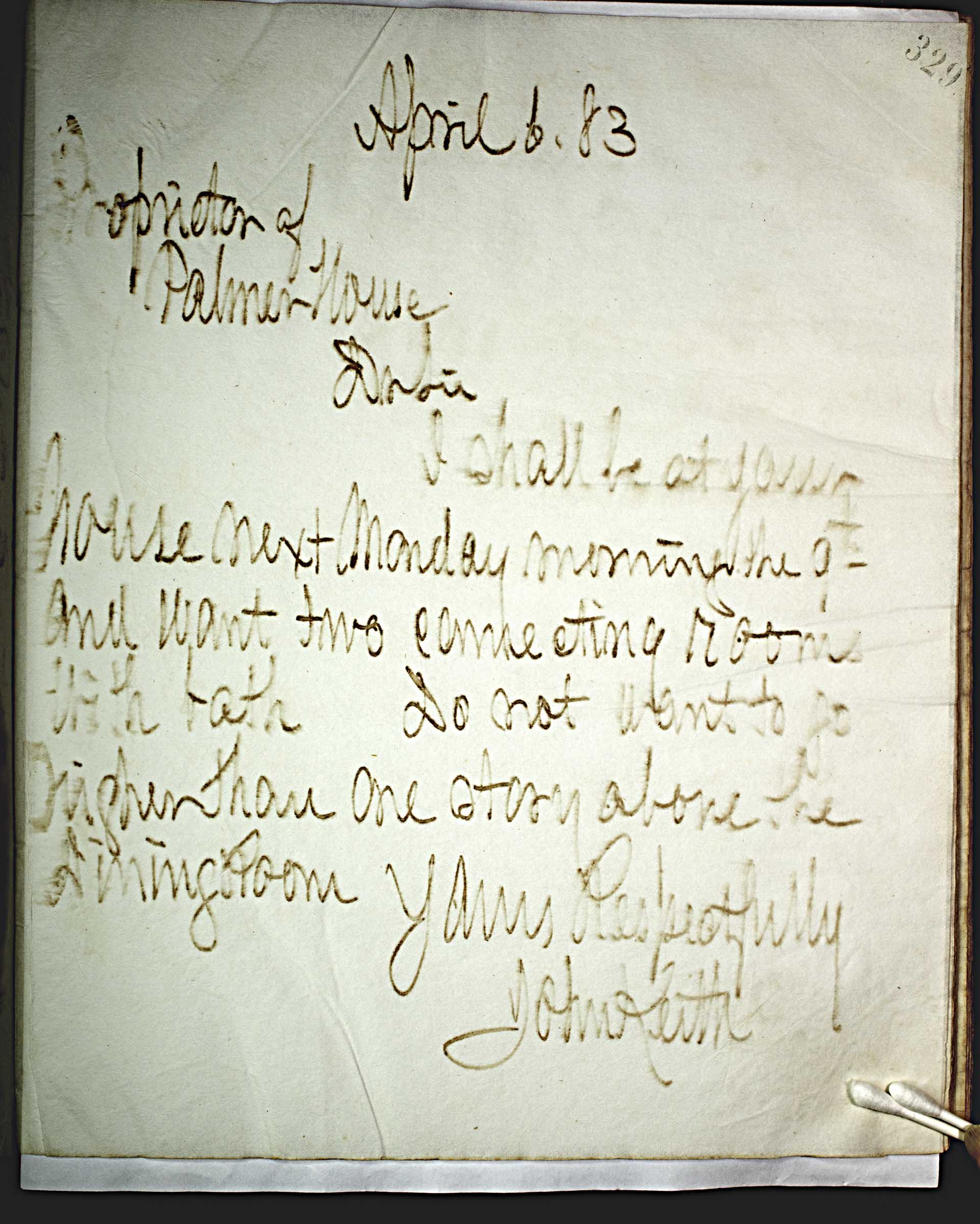 April 6, 83 [1883] -- Proprietor of -- Palmer House -- Dr Sir, -- I shall be at you house next Monday morning and want two connecting rooms with bath. Do not want to go higher than one story above the dining room. -- Yours Respectfully -- John Keith --
