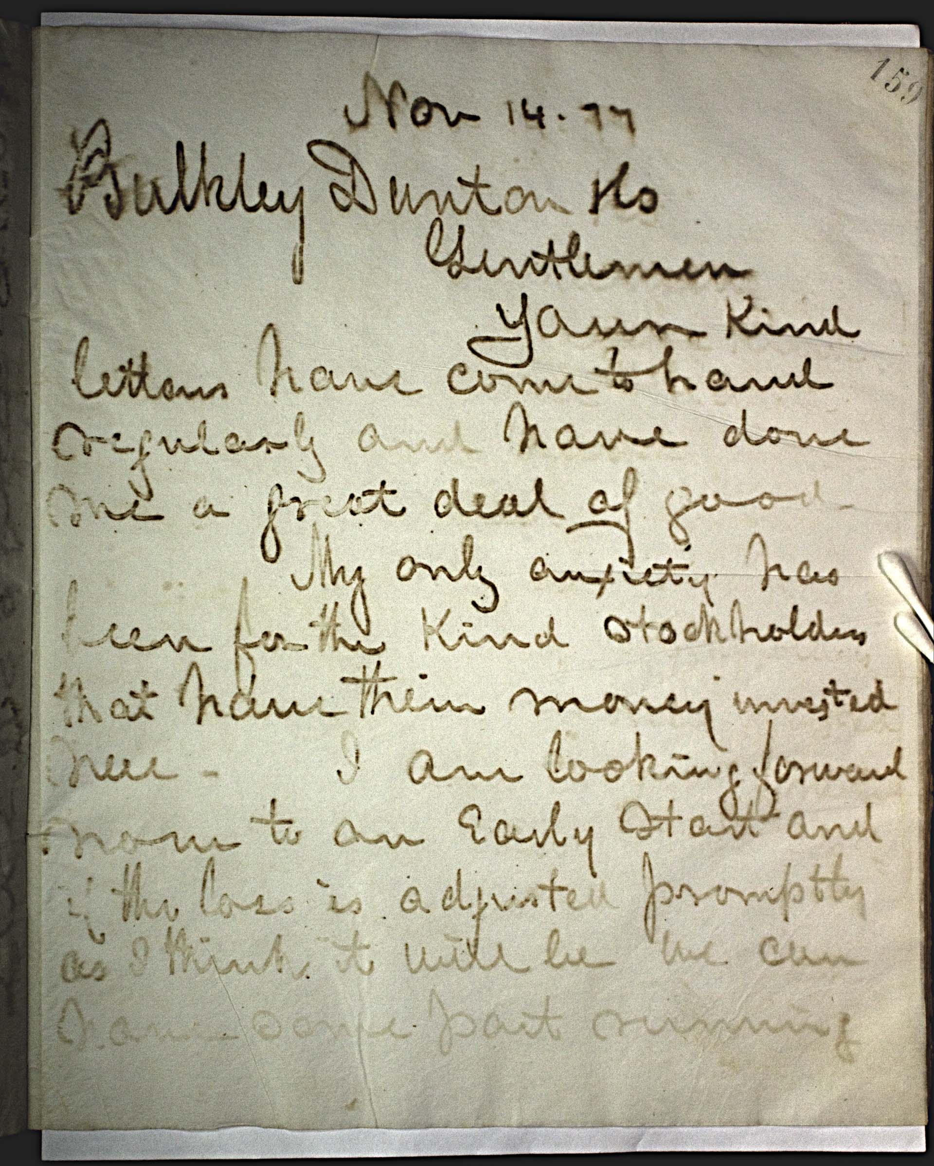 (Editor's note: The Keith Paper mill was destroyed on November 7, 1877. This letter was written 7 days after the fire.) -- -- Nov. 14, 77 (1877) -- Bulkley Dunton Co. -- Gentlemen, -- Your kind letters have come to hand regularly and have done me a great deal of good. -- My only anxiety has been for the Kind stockholders that have their money invested here. -- I am looking forward now to an early start and if the loss is adjusted promptly, as I think it will be, we can some part running -- ; -- Headline frrom the Turners Falls Reporter: -- November 7, 1877 -- OUR GREAT LOSS ! -- Disastrous Fire This Morning! -- The Magnificent Keith Mill Burned to the Ground -- Three Hundred Persons Thrown Out of Employment. -- LOSS NEARLY $400,000!