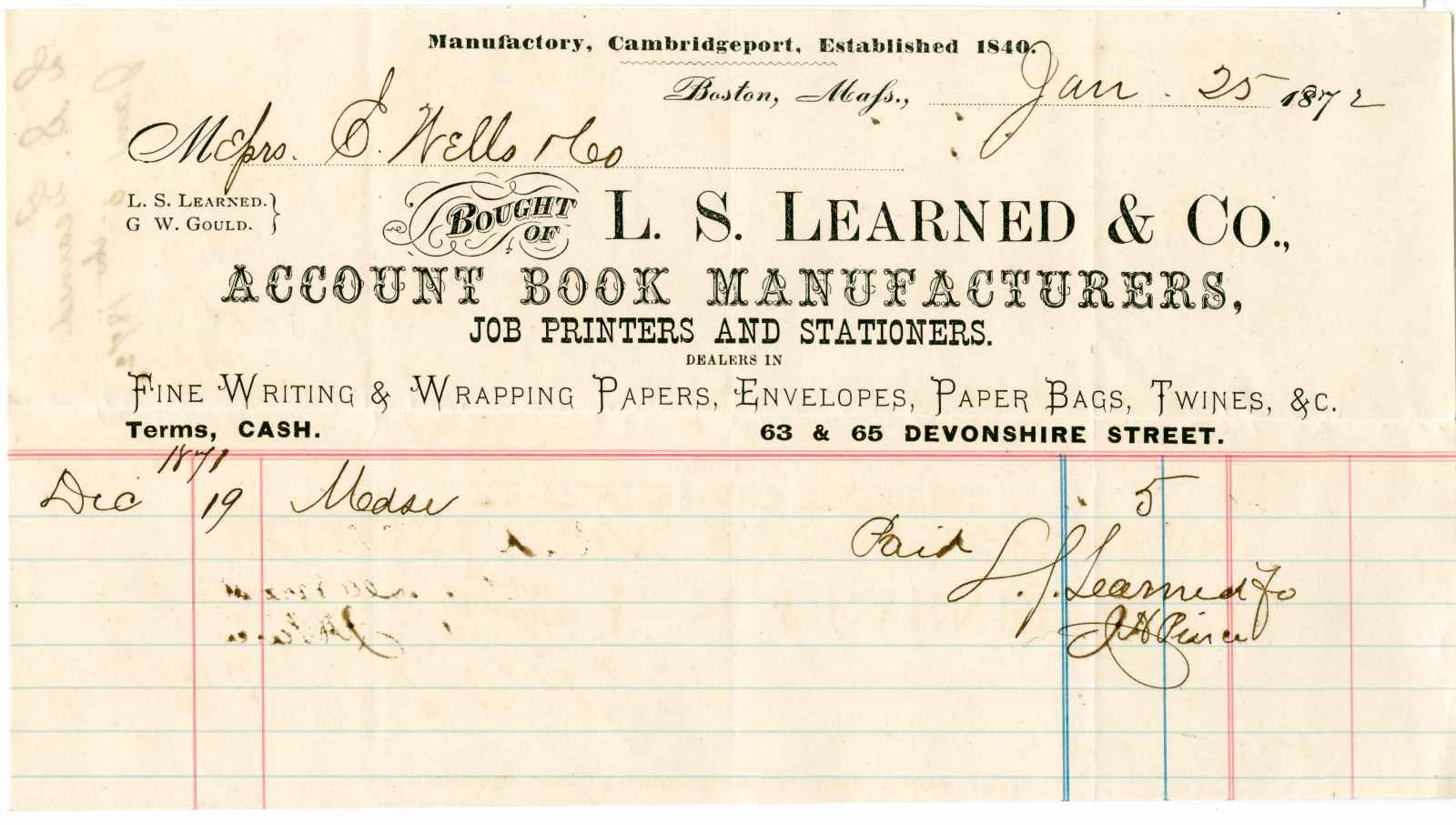 receipt; Learned, L. S. & Co. - Account Books, Paper, Envelopes & Stationery - €” Boston