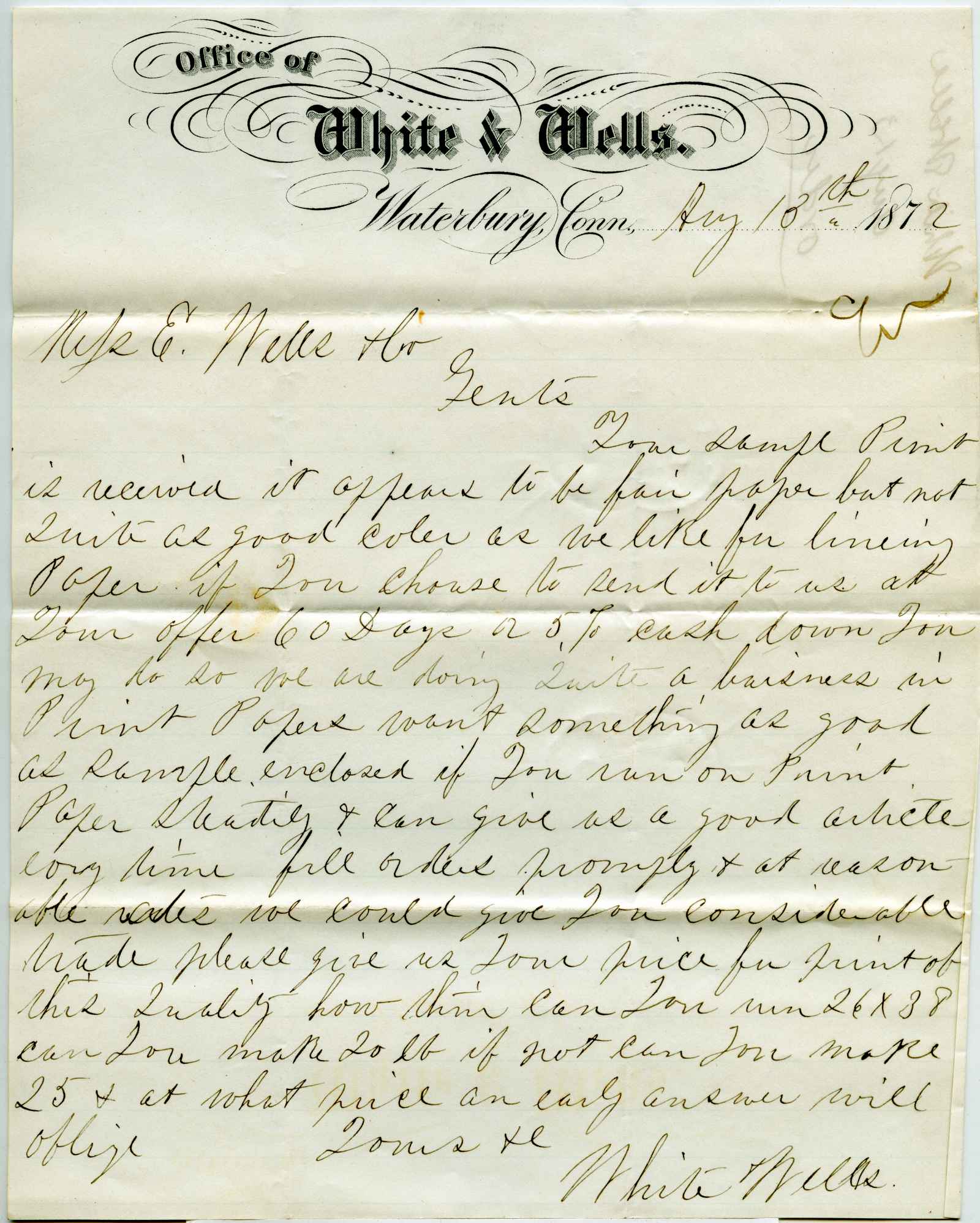 incoming correspondence to the papermaking company of Elisha Wells - circa 1870