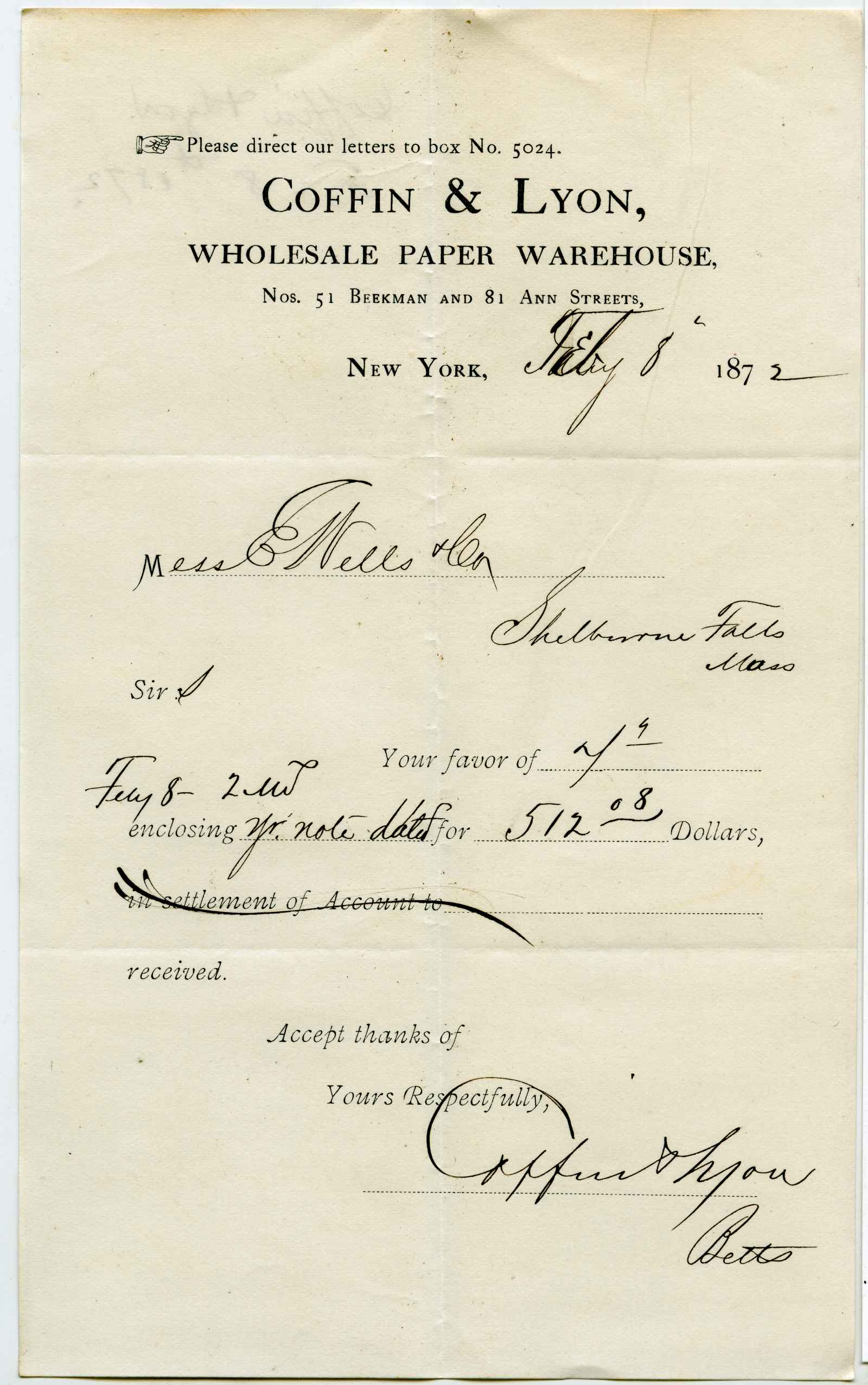 receipt; Coffin & Lyon - Wholesale Paper Warehouse - N.Y.