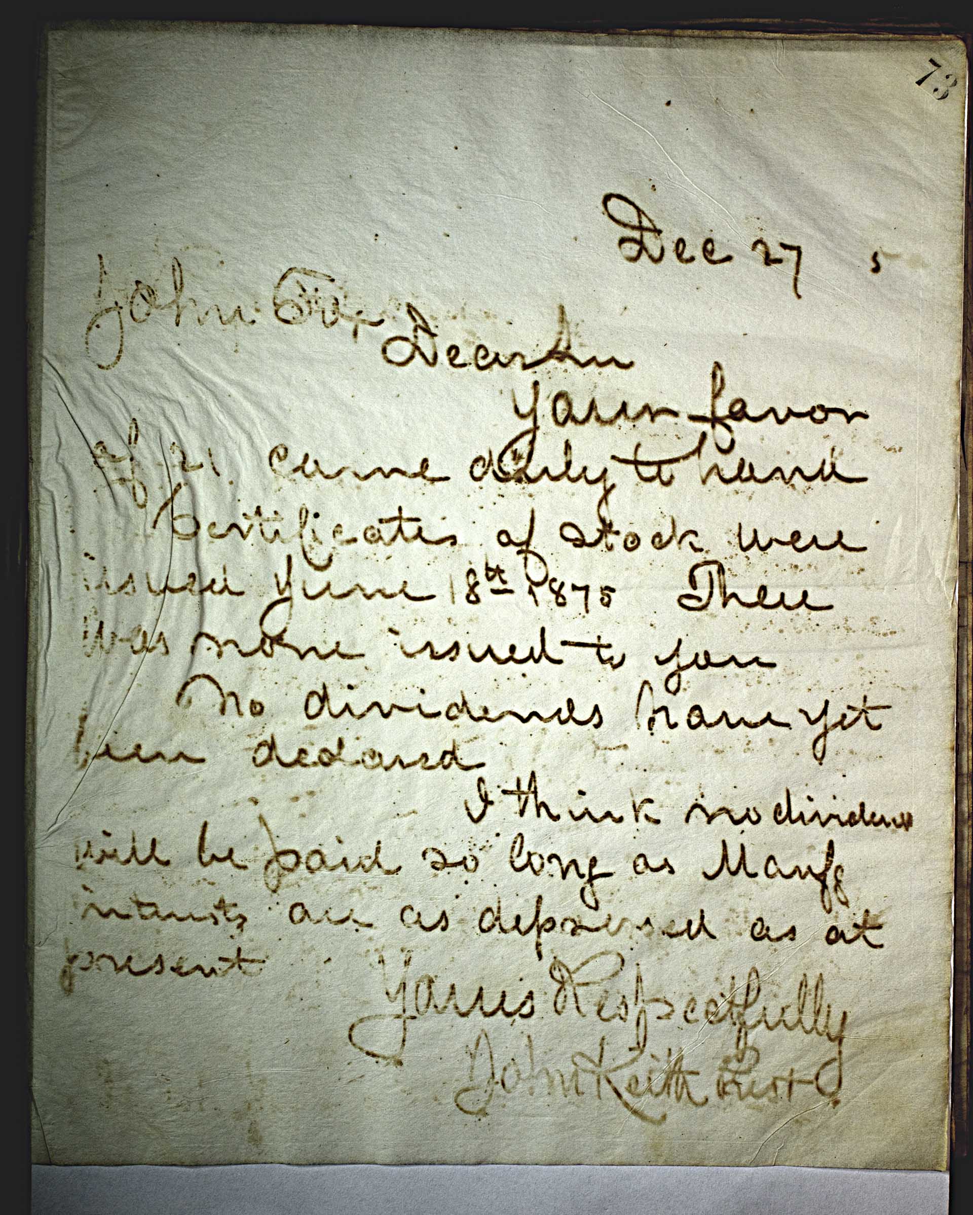 Dec 27 5 [1875] -- John Fox -- Dear Sir, -- Your favor of 21 comes duly to hand. -- Certificates of stock were issued June 18th 1875 There was none issued to you -- No dividends have yet been declared. -- I think no dividends will be paid so long as Manfs interests are as depressed as at present -- Yours Respectfully John Keith Prest --