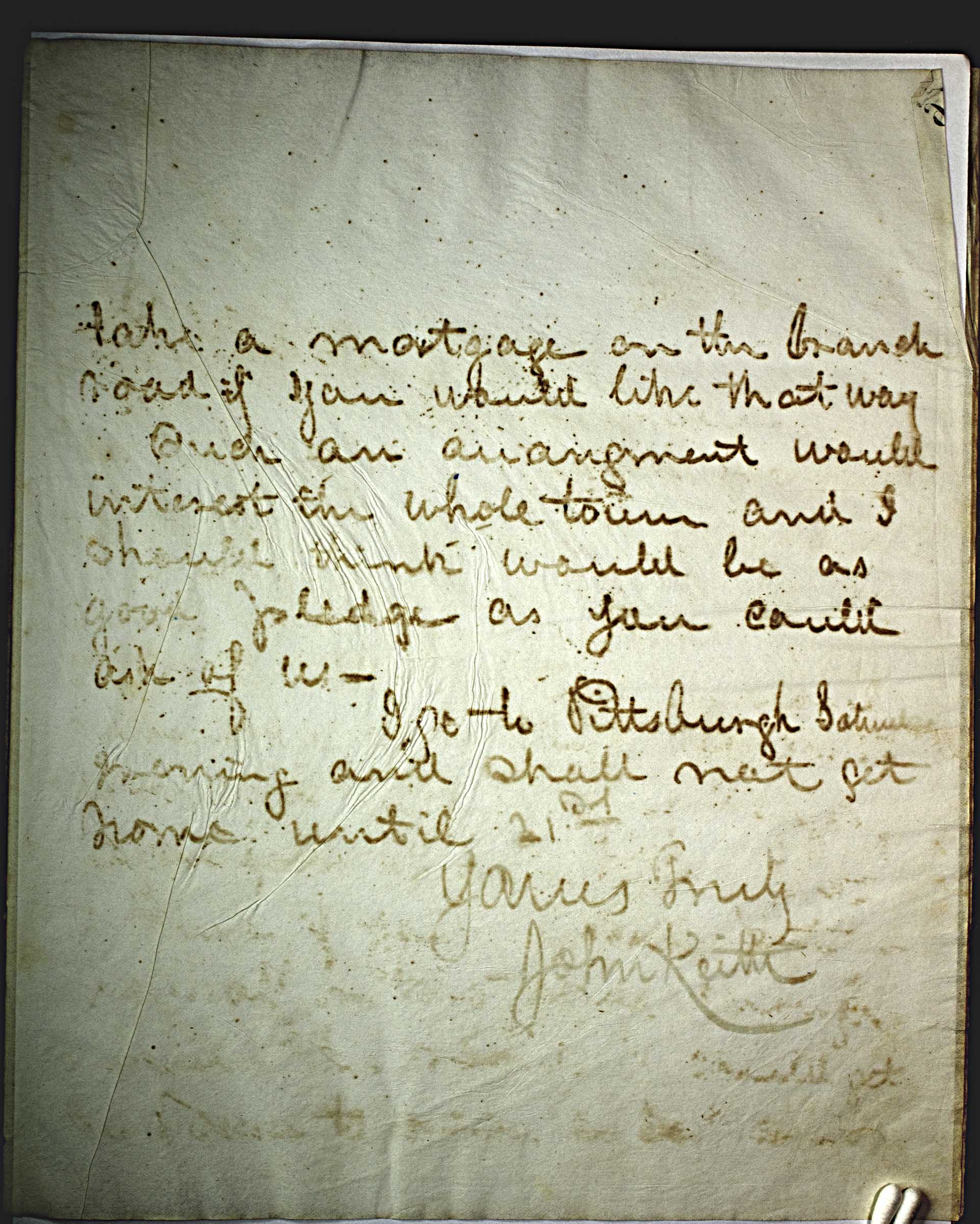 take a mortgage on the branch road if you would like. Such an arrangement would interest the whole town and I should think would be as good pledge as you could ask of us – I go to Pittsburgh Saturday morning and shall not get home until 21st -- Yours truly, -- John Keith --