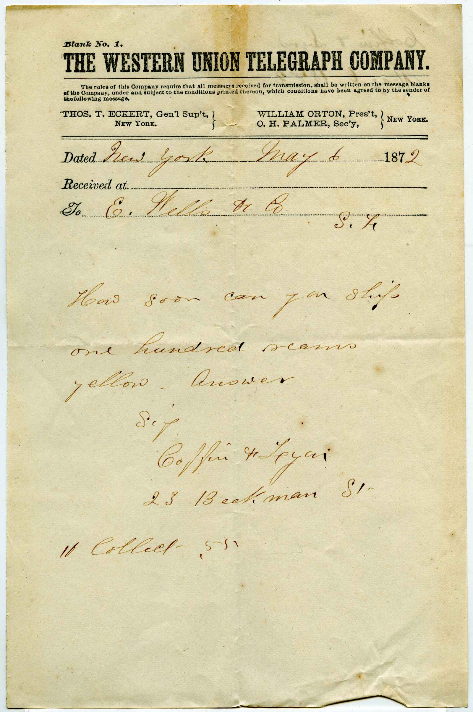 telegram; Coffin & Lyon - Wholesale Paper Warehouse - N.Y.