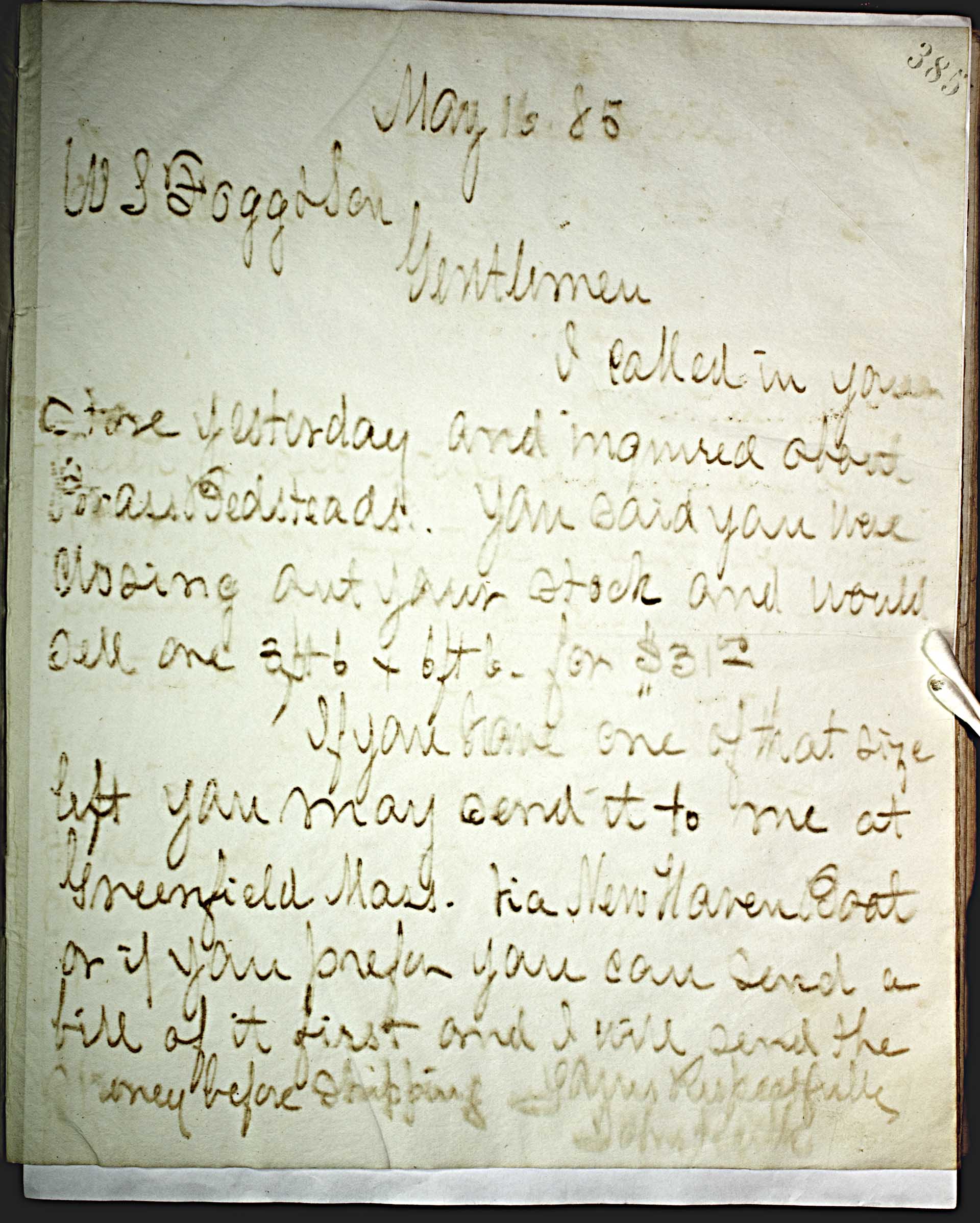 | dc.description | May 16, 85 [1885] -- W. S. Fogg & Son -- Gentlemen, -- I called in your store yesterday and inquired about brass bedstands. You said you were closing out your stock and would sell one 3ft 6 x 6ft. for $31.00 -- -- If you have one of that size left you may send it to me at Greenfield Mass. Via New Haven Boat or if you prefer you can send a bill of it first and I will send the money before shipping. -- Yours Respectfully -- John Keith -- | |