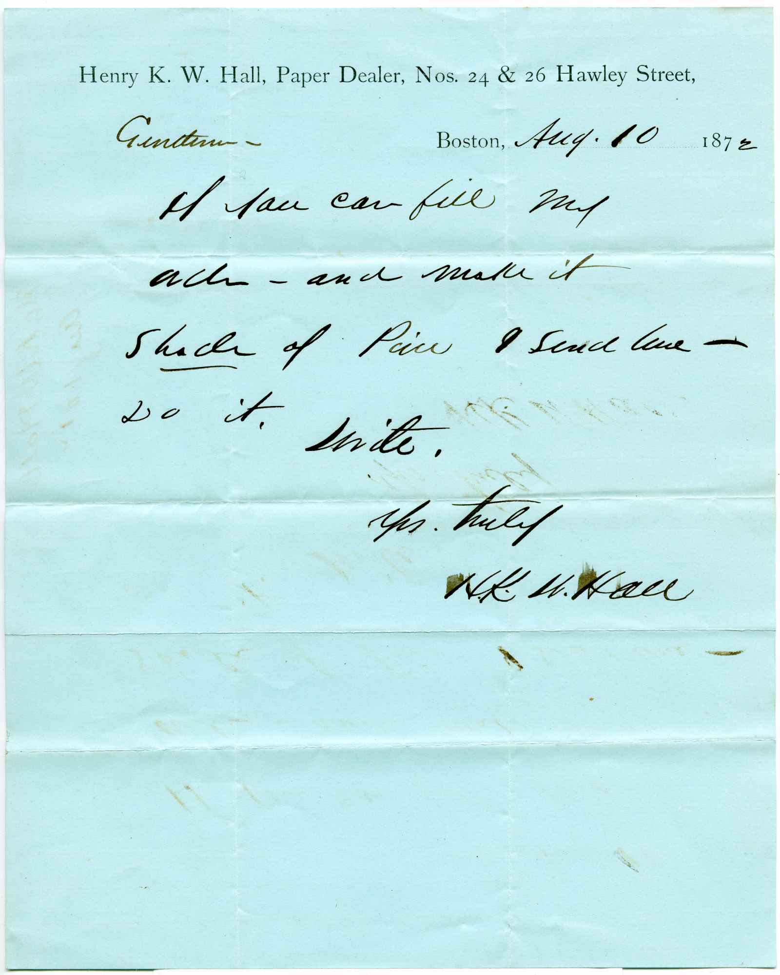 letter; Hall, Henry K.W. - Paper & Twine Dealer - Boston