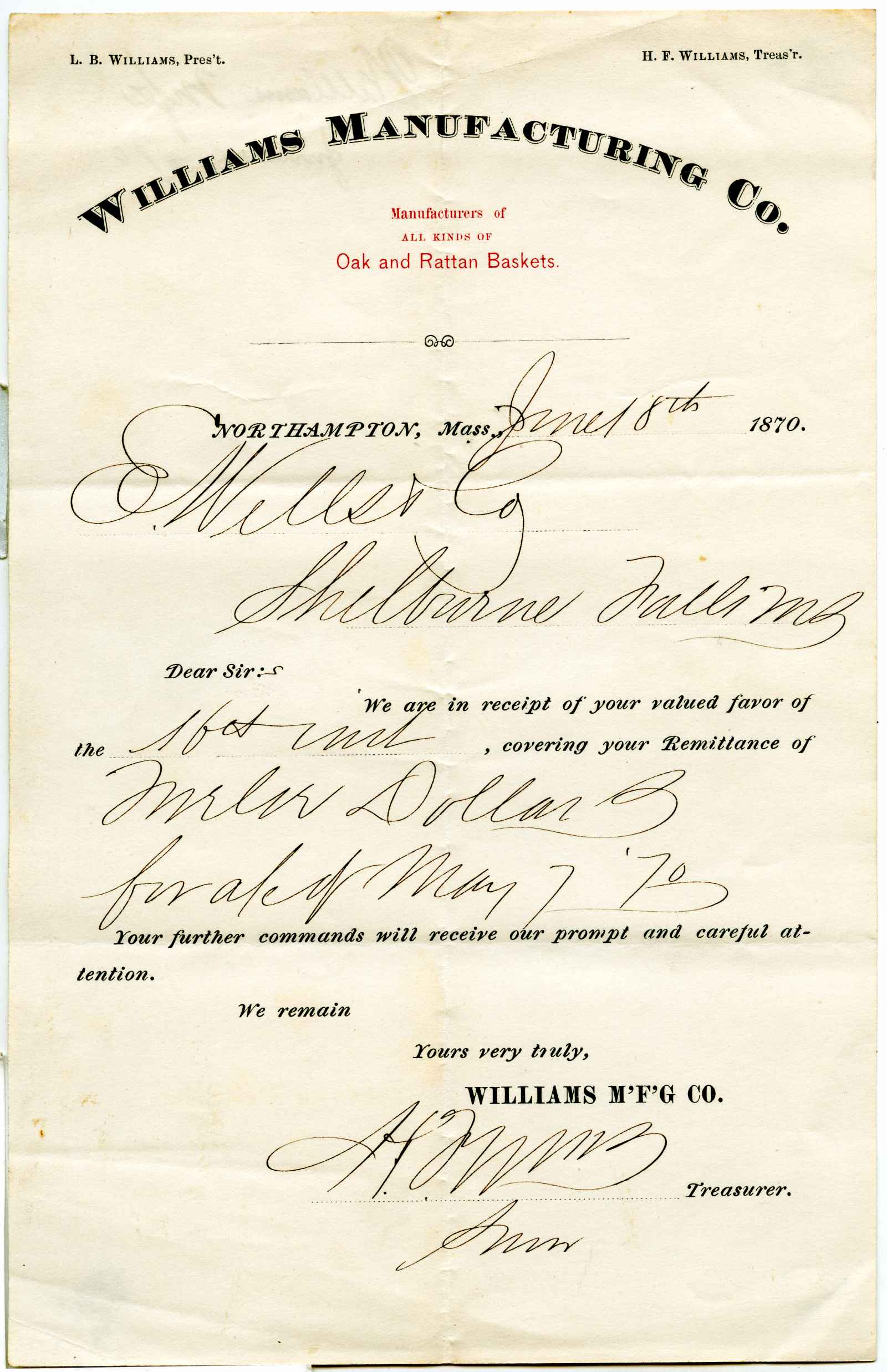letter; Williams Manufacturing Co. - Oak & Rattan baskets - Northampton, Ma.