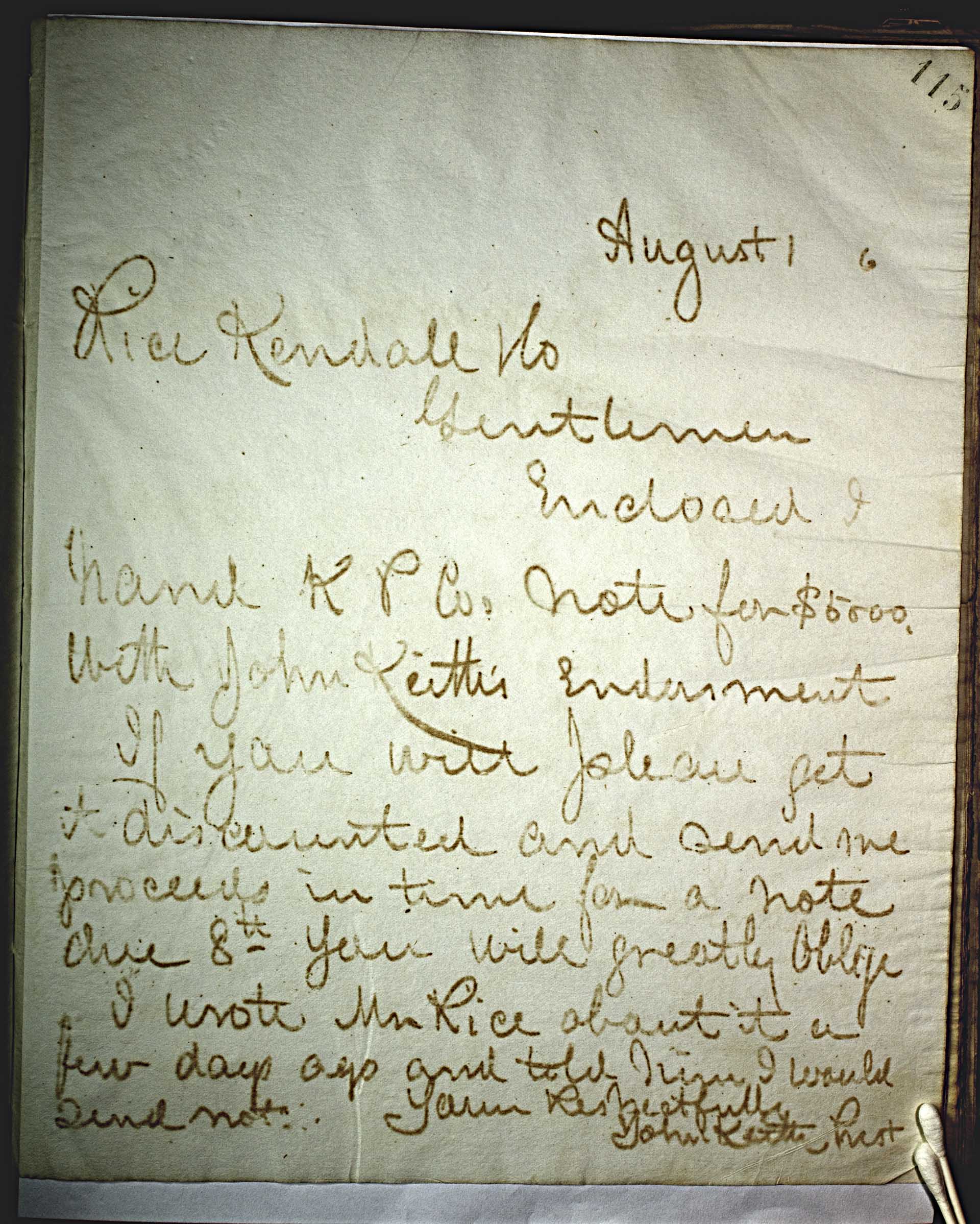 August 1 6 [1876] -- Rice Kendall Co. -- Gentlemen, -- Enclosed I hand K P Co. note for $5000. With John Keith’s endorsement. -- If you will please get it discounted and send me proceeds in time for a note Aug. 8th you will greatly oblige. -- I wrote Mr. Rice about it a few days ago and told him I would send note. -- Yours Respectfully -- John Keith Prest --