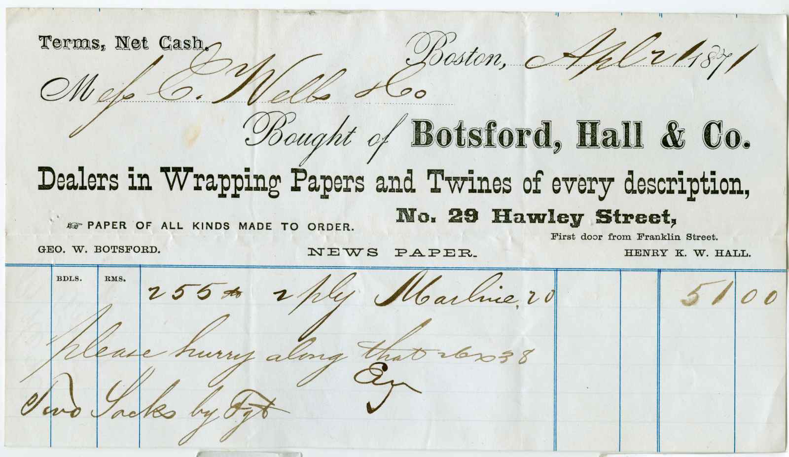 invoice; Botsford, Hall & Co. - Paper & Twine - Boston