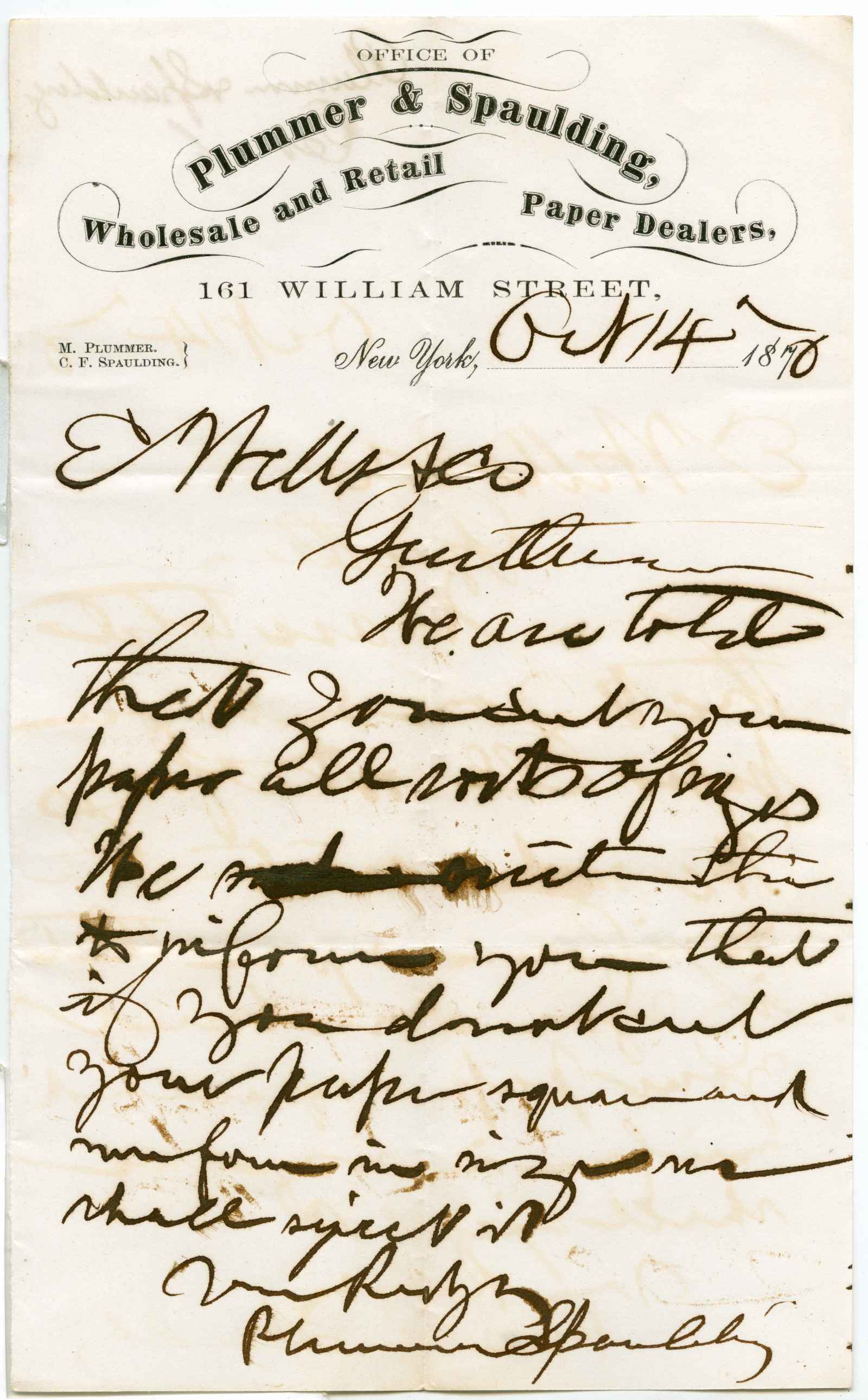 letter; Plummer & Spaulding - Paper dealers - N. Y.