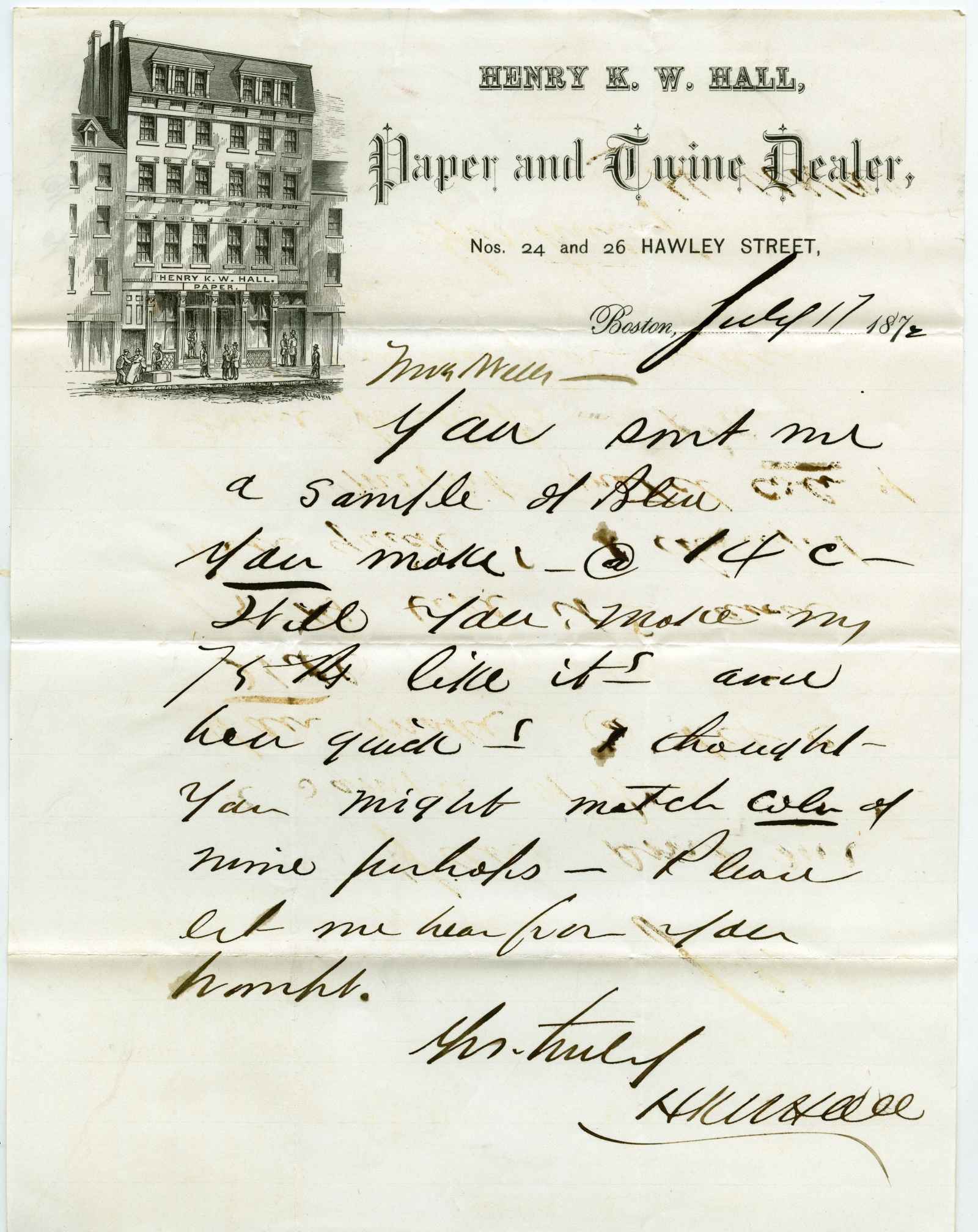 letter; Hall, Henry K.W. - Paper & Twine Dealer - Boston