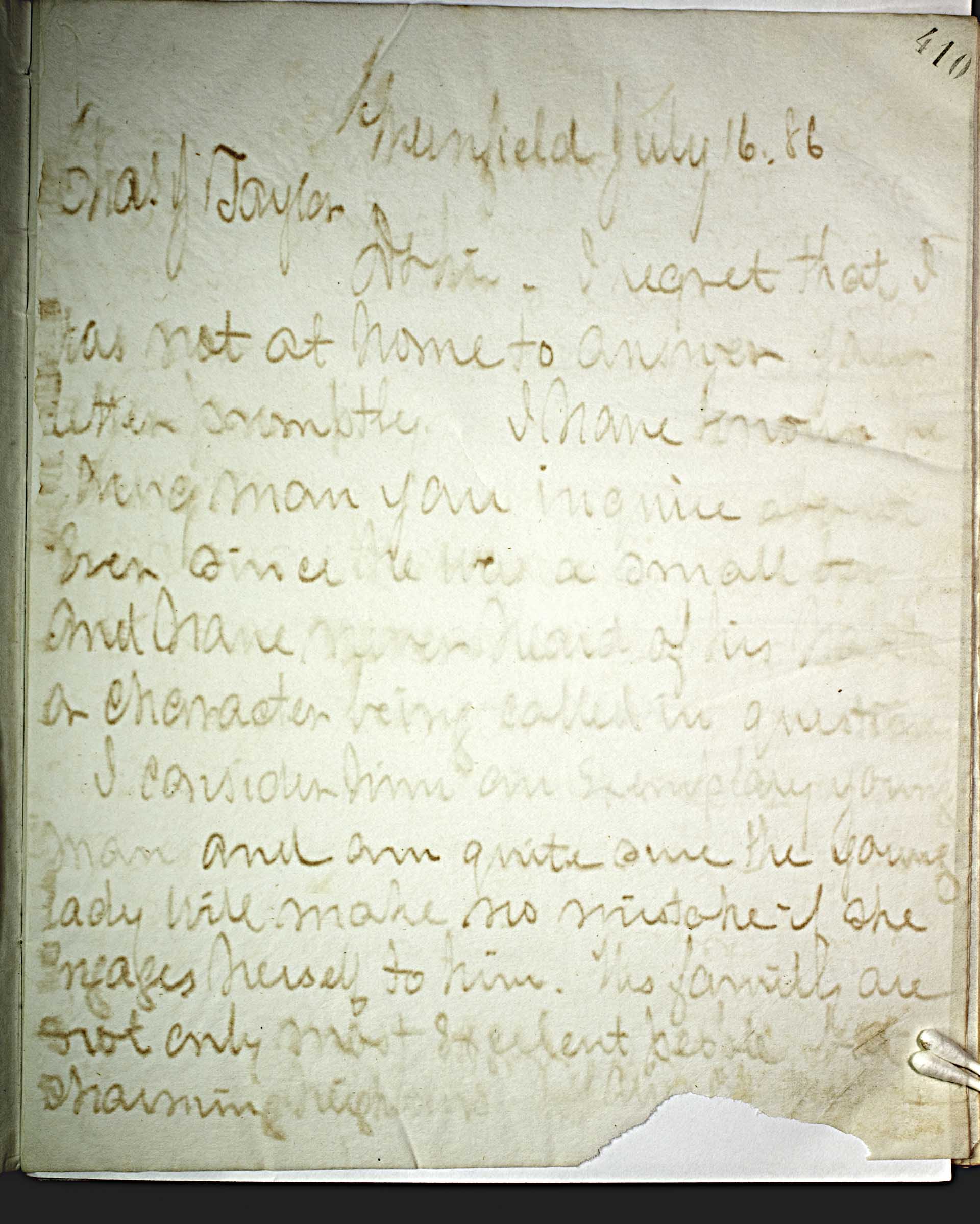 Greenfield, July 16, 86 [1886] -- Chas J. Taylor -- Dr Sir, -- regret that I was not a home to answer your letter promptly. I have known the young man you inquire about ever since he was a small boy and have never heard of his [name] or character being called in question. -- I consider him an exemplary young man and am quite sure the young lady will make no mistake if she engages herself to him. His family are not only most excellent people but charming neighbors. Paper torn away . . .[ no sig. available. -- e.g. -- ] --