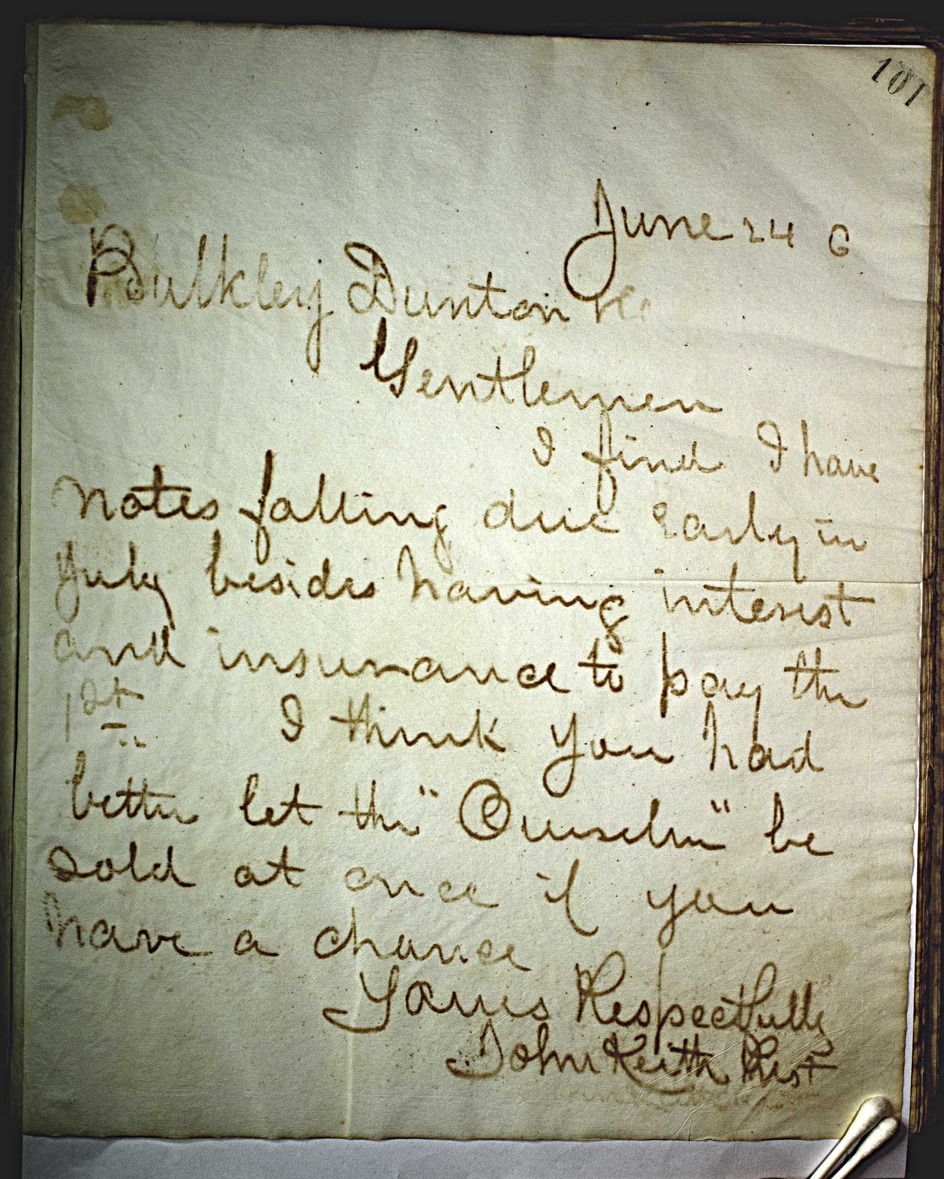 Bulkley Dunton & Co. -- Gentleman, -- I find I have notes falling due early in July besides having interest and insurance to pay the 1 -- st -- . -- I think you had better let the “[?]” be sold at once if you have a chance. -- Yours Respectfully -- John Keith Prest --