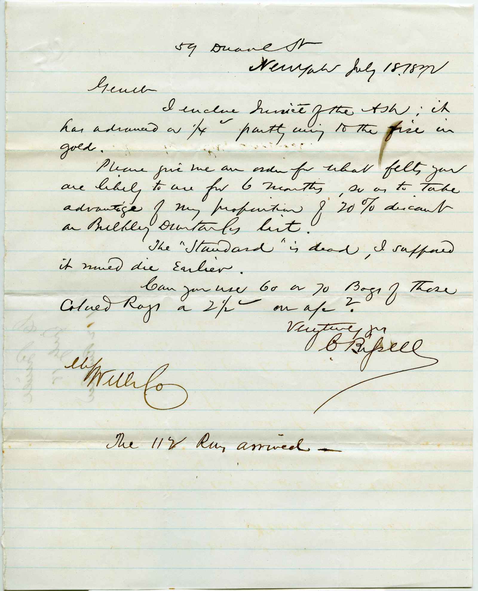 incoming correspondence to the papermaking company of Elisha Wells - circa 1870