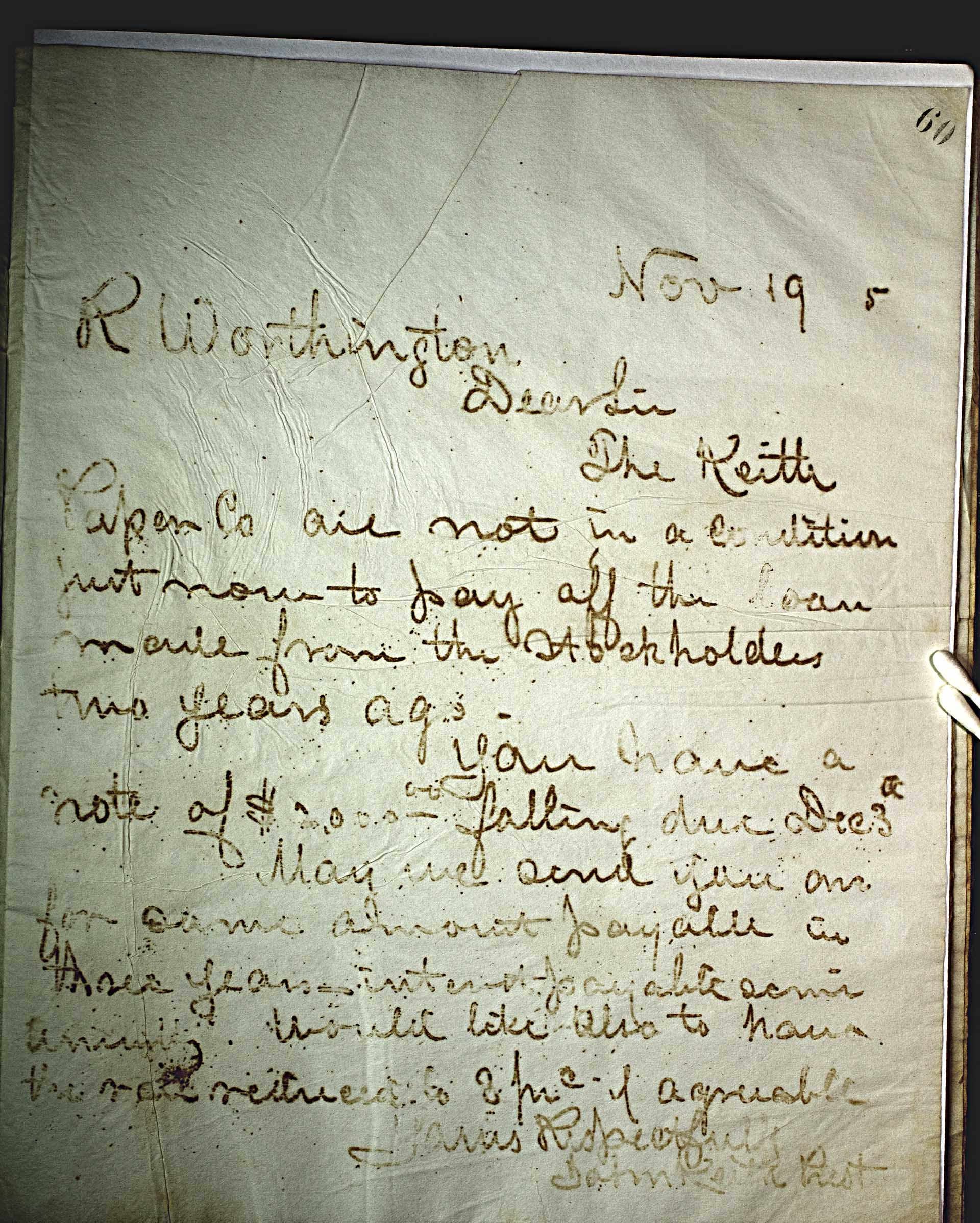 Nov 19 5 [1875] -- R. Worthington -- Dear Sir -- The Keith Paper Co are not in a condition just now to pay off the loan made from the Stockholders two years ago. -- You have a note of $2,000.00 -- falling due Dec 3 -- d -- for same amount payable on these years—interest payable semi annually. Would like also to have the rate reduced to 8 -- prc -- if agreeable. -- Yours Respectfully -- John Keith Prest --