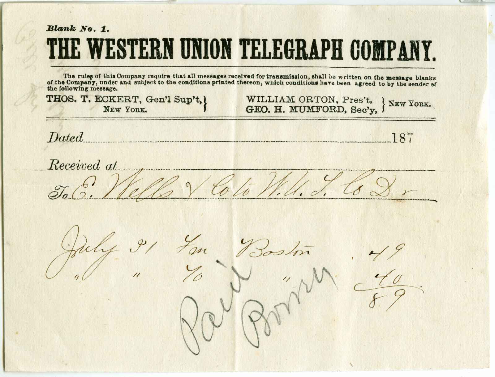 receipt; Western Union Telegraph Company - receipt for telegraph charges