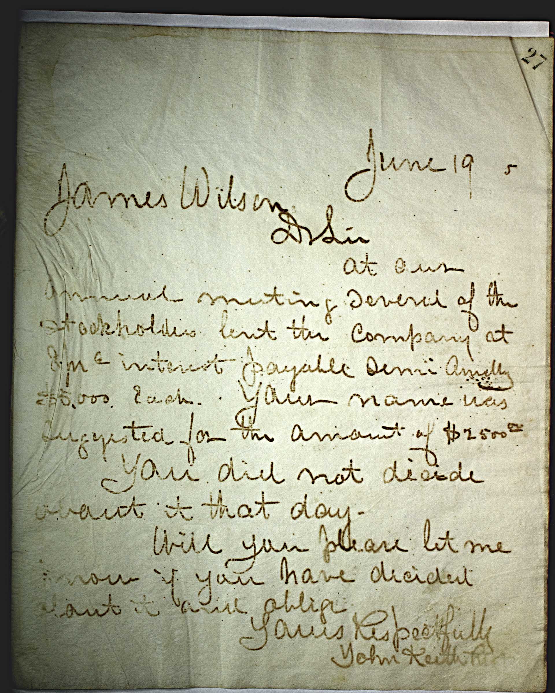 June 19 5 [1875] -- James Wilson -- Dear Sir -- At our annual meeting several of the stockholders lent the company at 8 ju -- c -- interest playable semi annually $5,000 each. Your name was suggested for the amount of $2500.00 -- -- You did not decide about it that day. Will you please let me know if have decided about it and oblige -- Yours Respectfully -- John Keith --