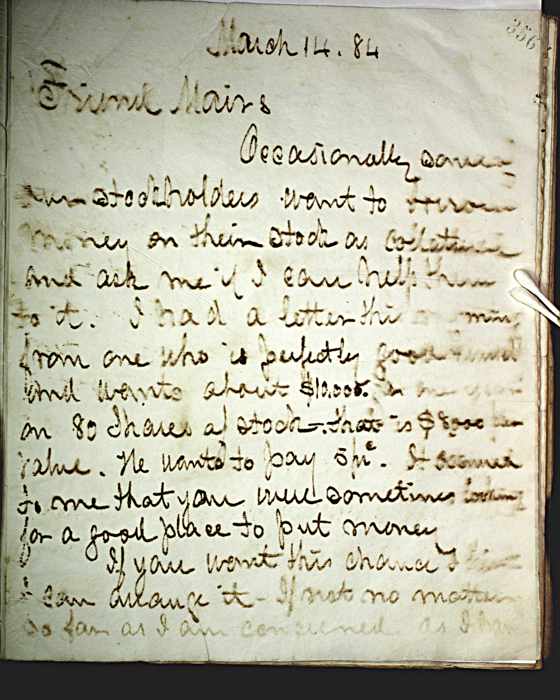 March 14. 84 [1884] -- Friend Mairs -- Occasionally some of our stockholders want to borrow money on their stock as collateral and ask me if I can help them do it. I had a letter this morning from one who is perfectly good in funds and wanted about $10,000 for one year on 80 shares of stock that is $8,000 par value. He wants to pay 5 -- prc -- . It occurs to me that you were sometimes looking for a good place to put money. -- If you want this chance I think I can arrange it. If not no matter so far as I am concerned as I have --