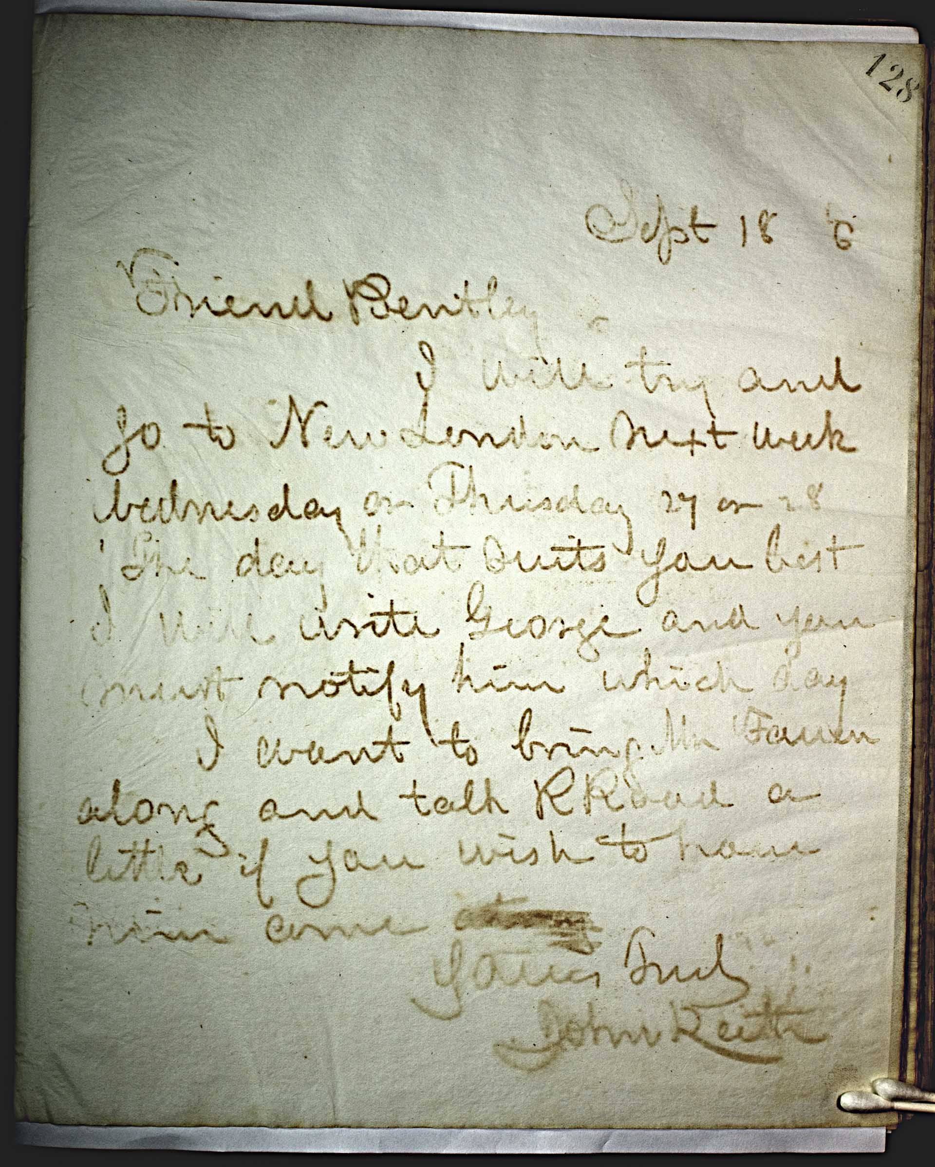 Sept 18 6 (1876) -- Friend Bentley, -- I will try and go to New London next week Wednesday or Thursday 27 or 28, the day that suits you best. I will write George and you must notify him which day. -- I want to bring Mr. Farren along and talk R. Road a little if you wish to have him come. -- Yours Truly, -- John Keith