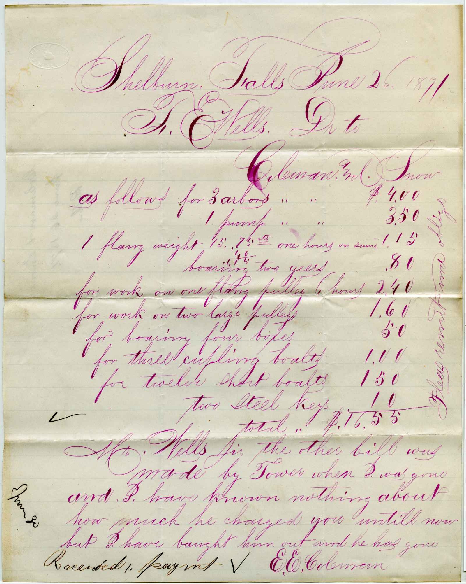 receipt; Coleman, E.E. - Machine Shop - Shelburne Falls, Ma.