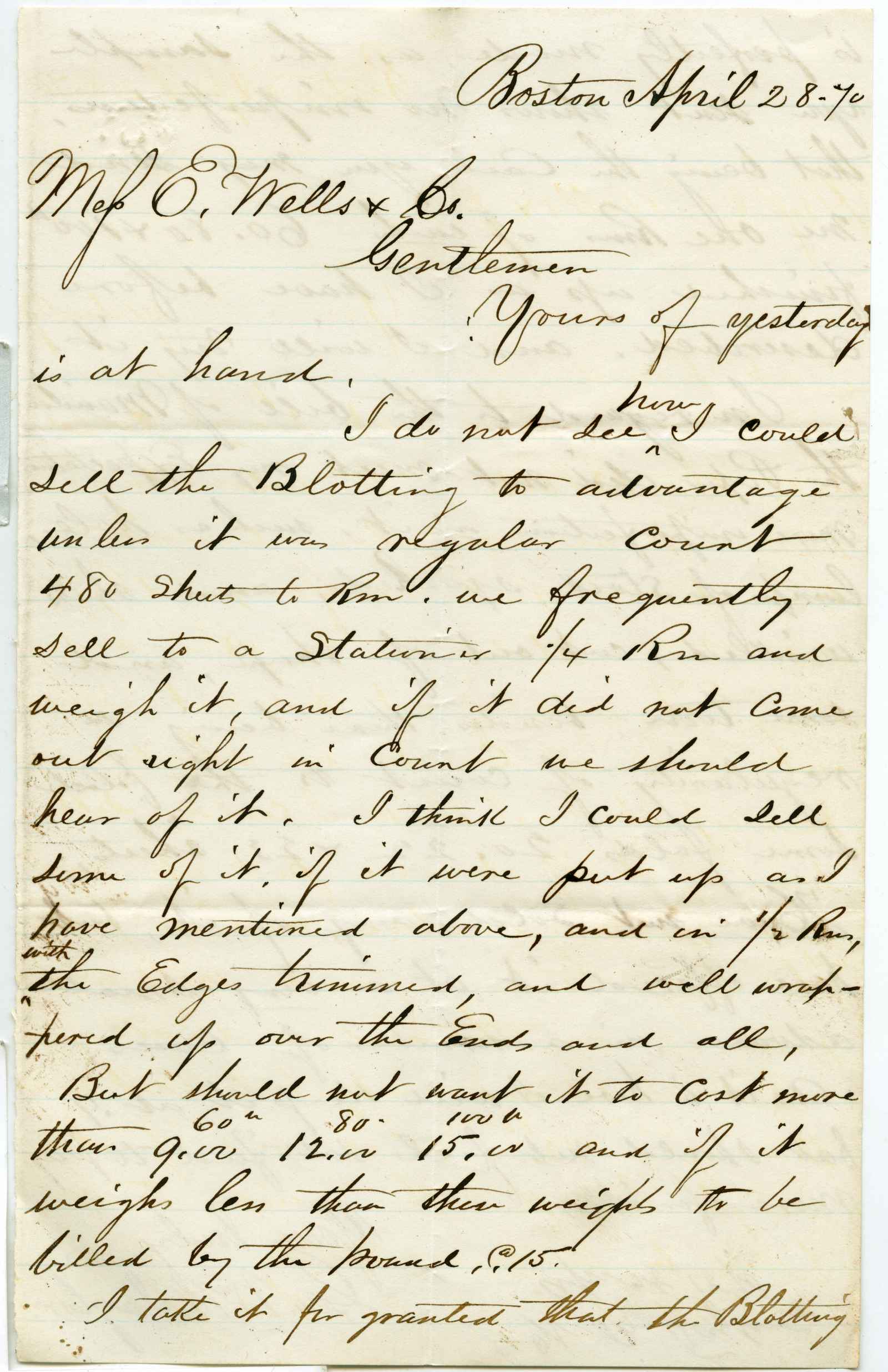 incoming correspondence to the papermaking company of Elisha Wells - circa 1870