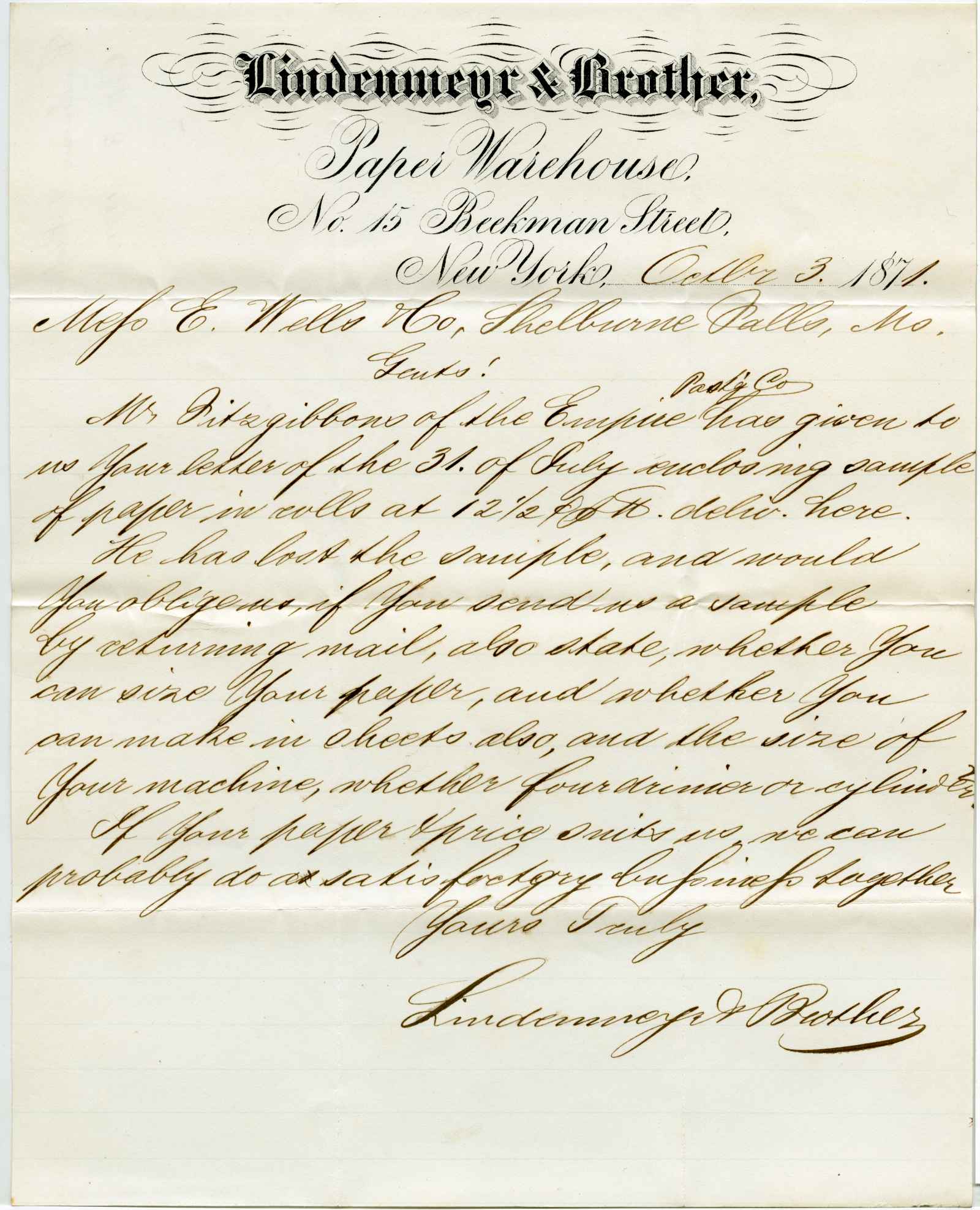 | dc.description | letter; Lindemeyer & Brother - Paper Warehouse - N.Y. | |