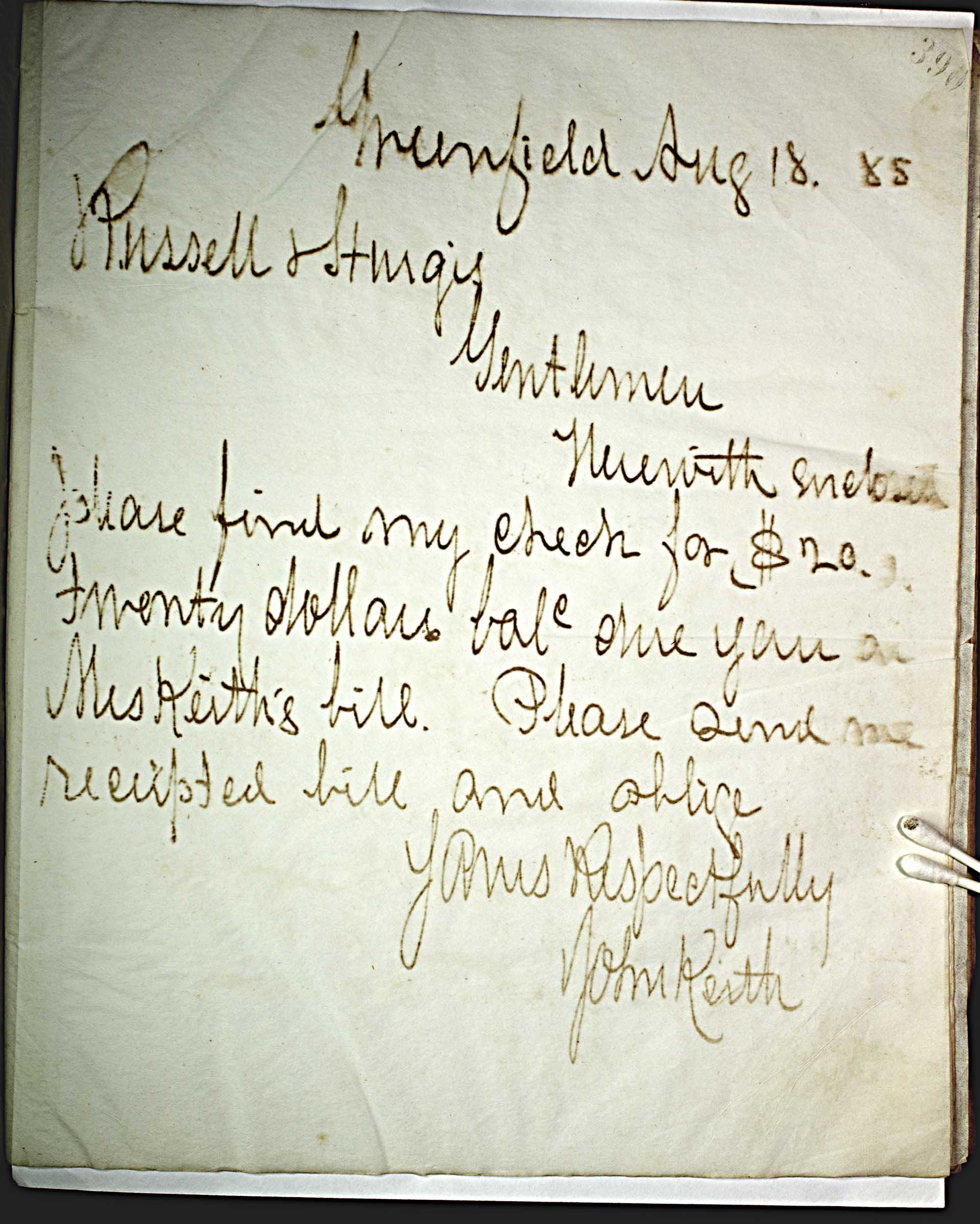 Greenfield Aug. 18, 5 [1885] -- Russell & Sturgis -- Gentlemen, -- Herewith enclosed please find my check for $20. Twenty dollars bal -- c -- I owe you on Mrs Keith’s bill. Please send me recipted bill and oblige. -- Yours Respectfully -- John Keith --