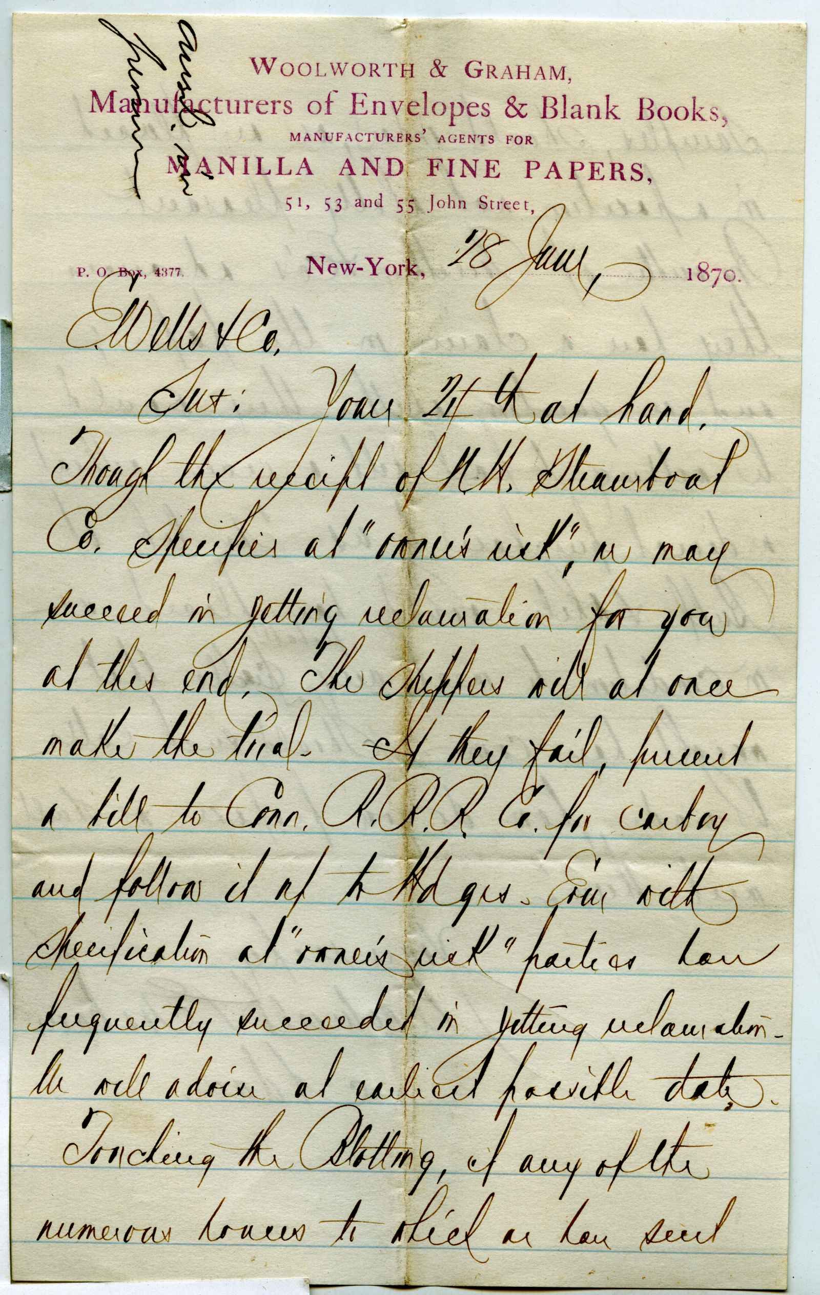 incoming correspondence to the papermaking company of Elisha Wells - circa 1870