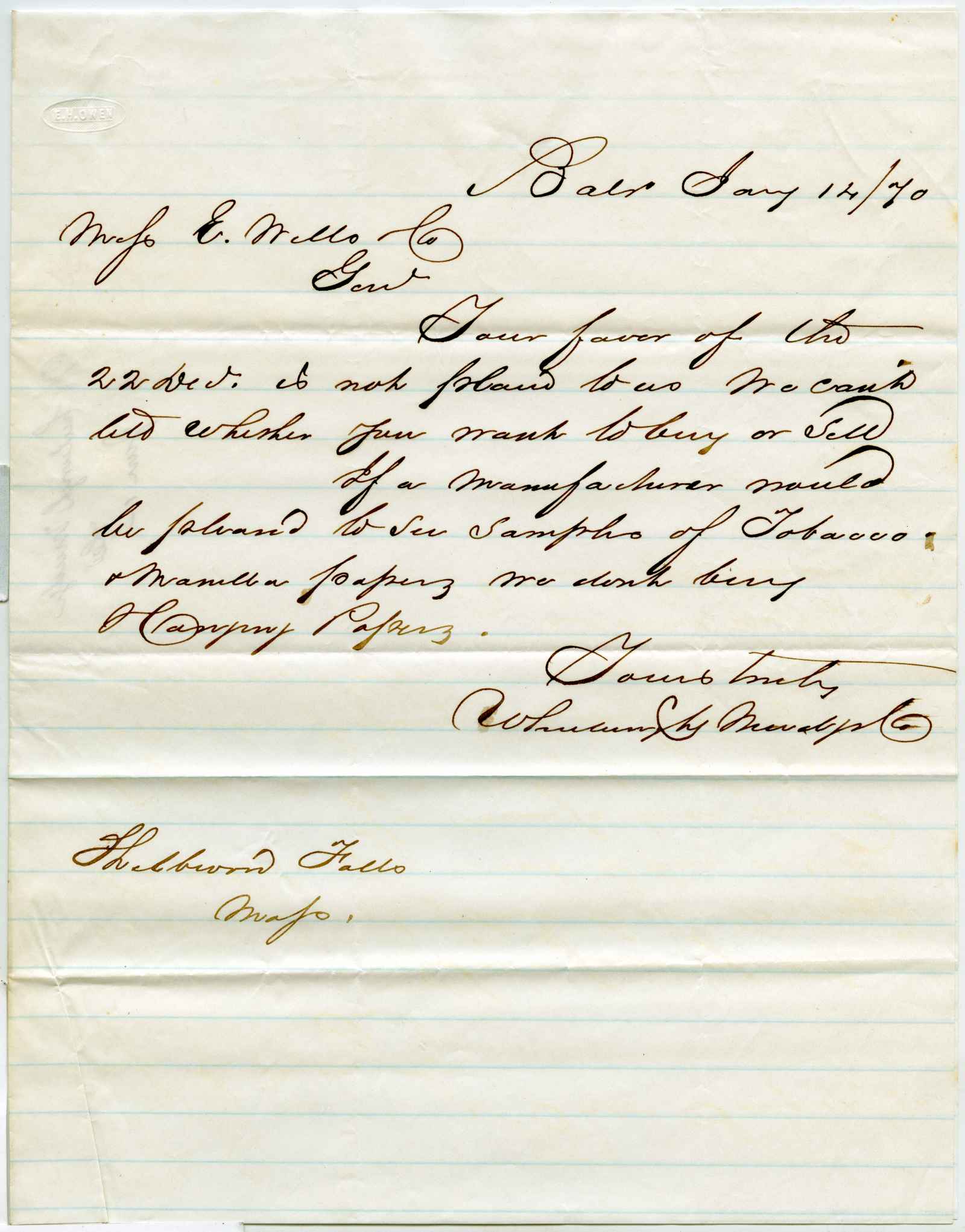 incoming correspondence to the papermaking company of Elisha Wells - circa 1870