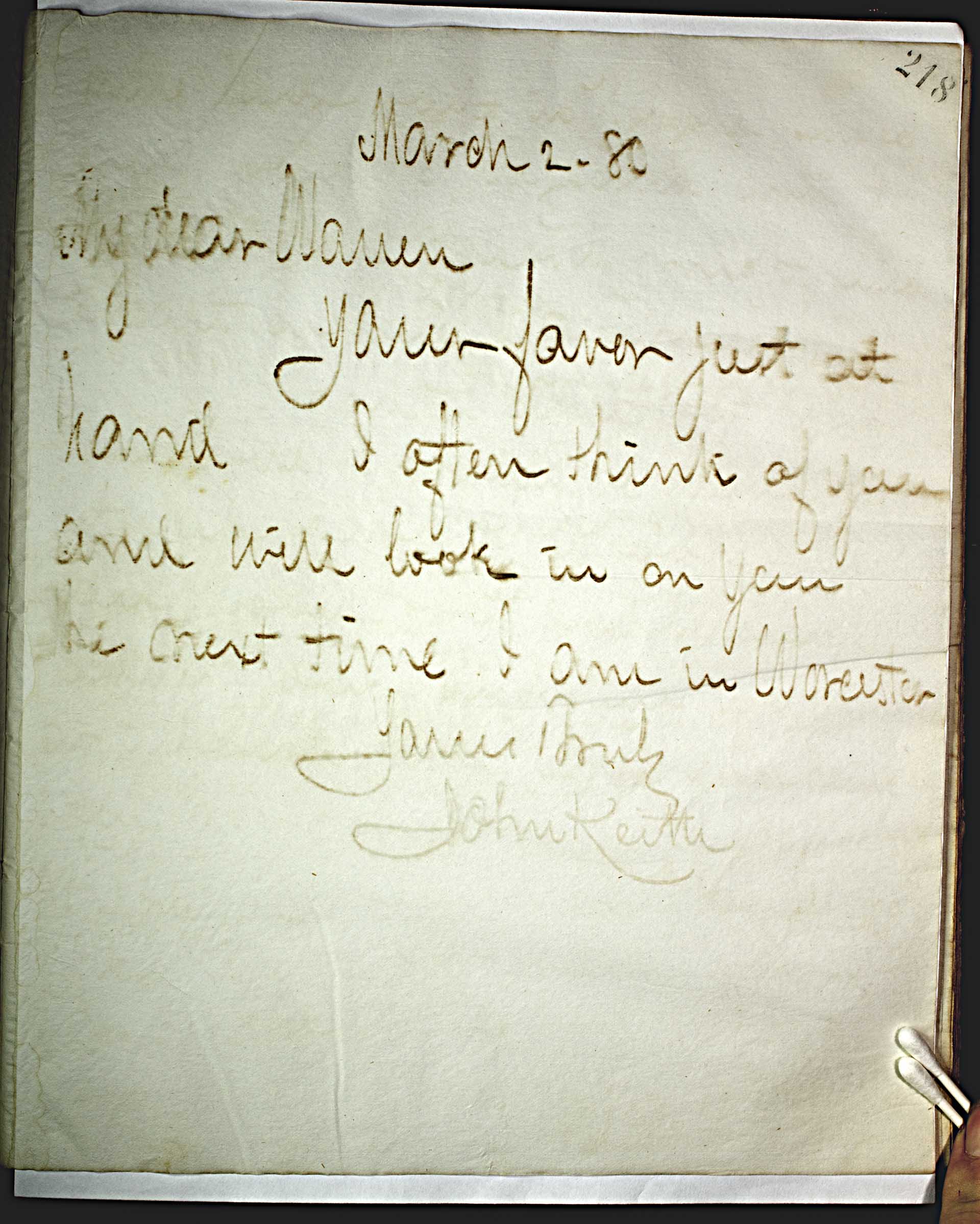 March 2- 80 [1880] -- My dear Warren, -- Your favor just at hand. I often think of you and will look in on you the next time I am in Worcester. -- Yours Truly -- John Keith --