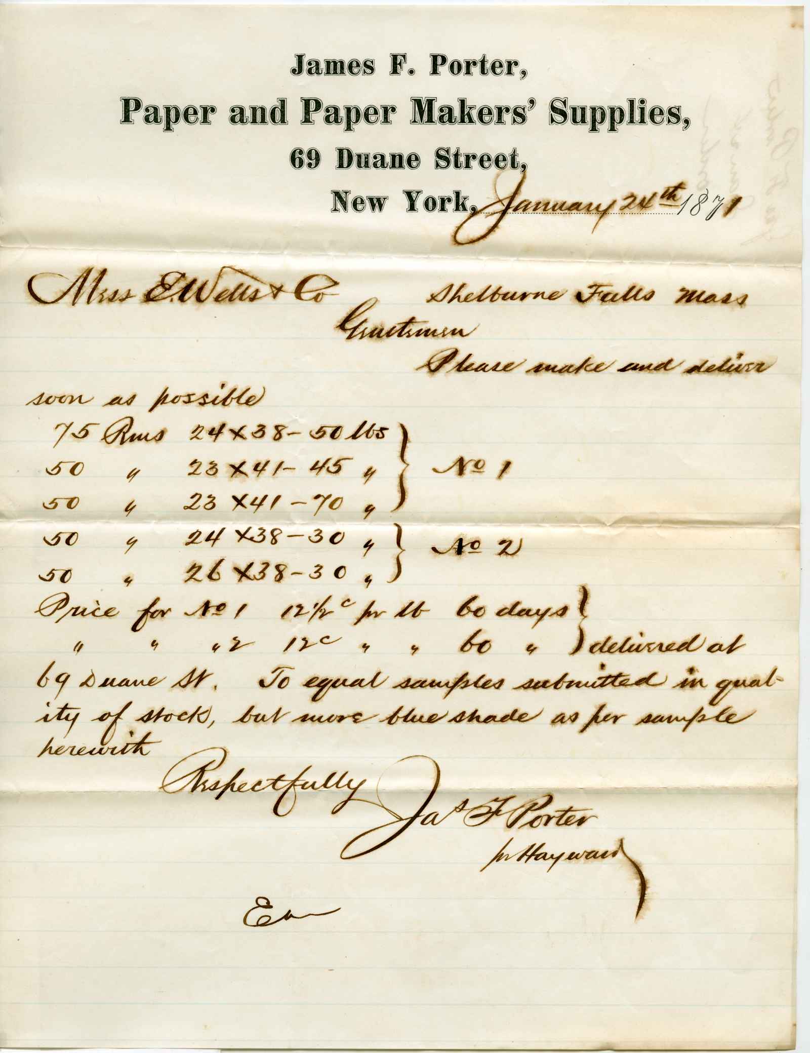 incoming correspondence to the papermaking company of Elisha Wells - circa 1870