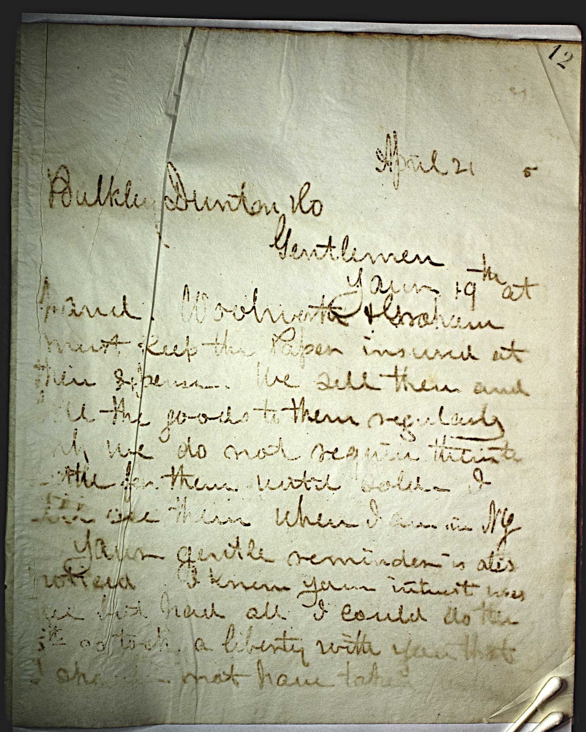 April 21, 5 (1875) -- Bulkley Dunton Co. -- Gentlemen, -- Your 19th arrived at hand. Woolwenten & Graham must keep the paper insured at their expense. We sell them and U the goods to them regularly only we do not require them we do not require them to that for them until sold. & I’ll see them when I arrive in NY. Your gentle reminder is also justified. I knew your interest was for both but have all I could do this 5th so took a liberty with you that I should not have taken -- --