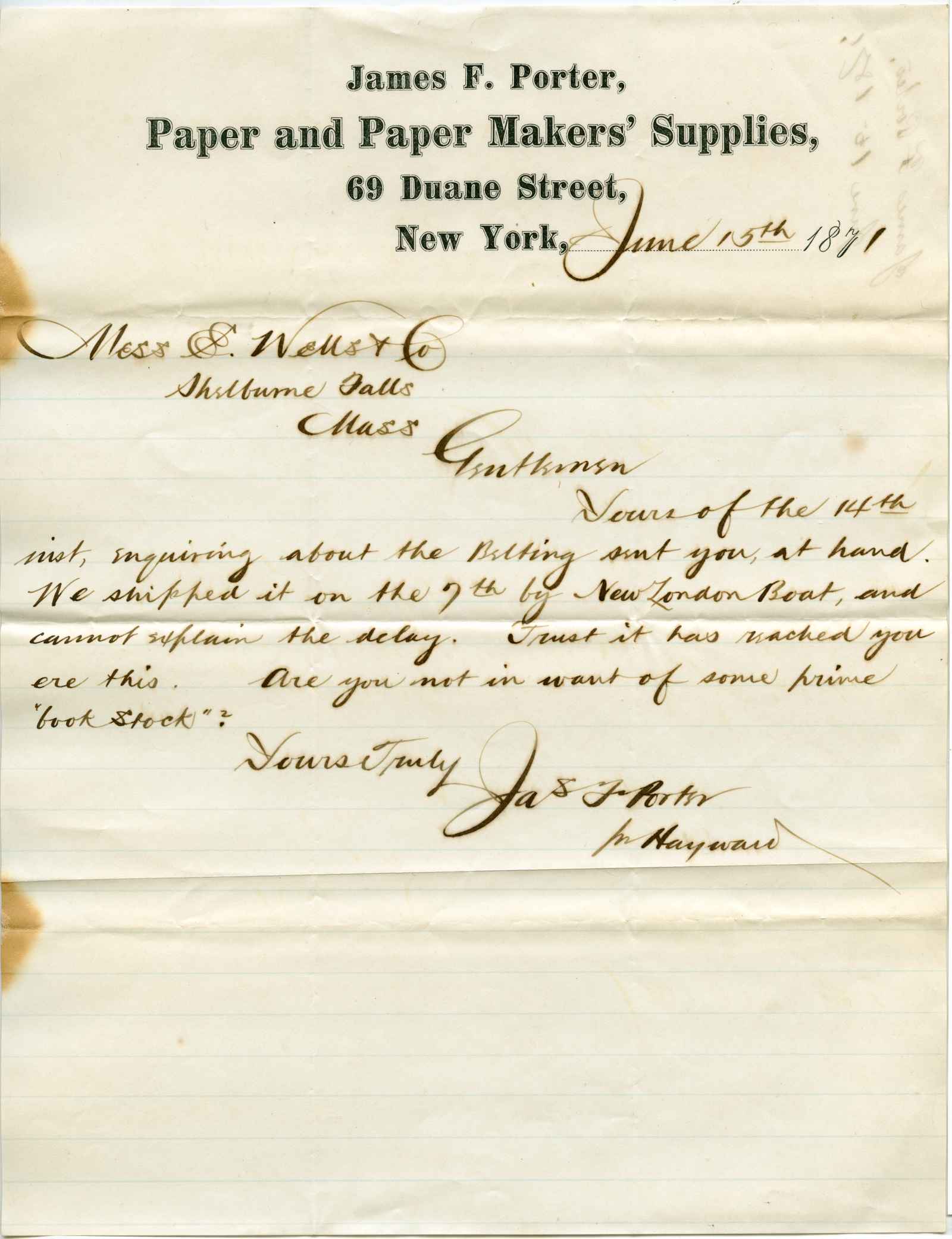 letter; Porter, James & F. - Paper and Paper Maker's Supplies - N.Y.