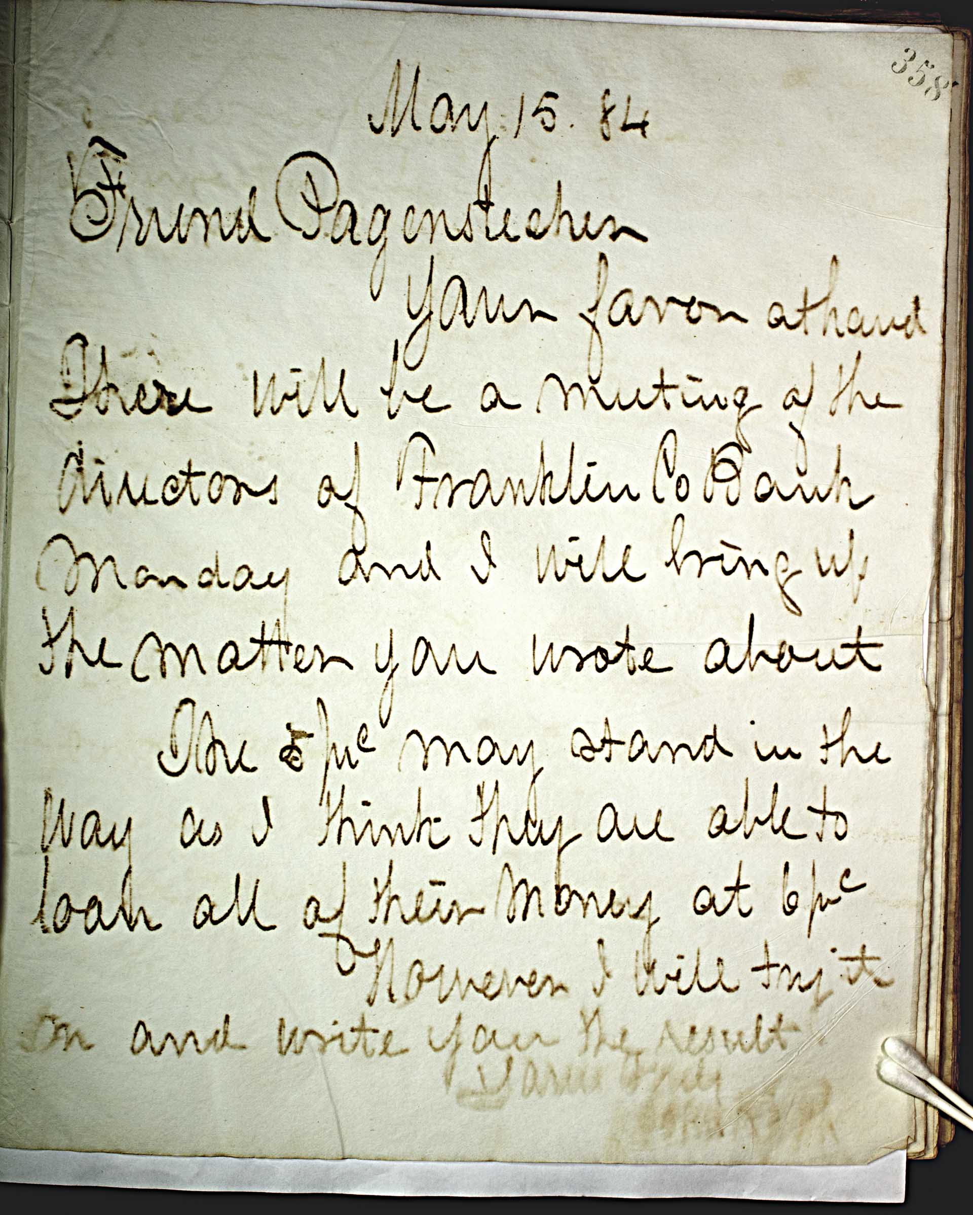May 15, 84 [1884] -- Friend Pagenstecher. -- Your favor at hand. -- There will be a meeting of the directors of Franklin Co. Bank Monday and I will bring up the matter you wrote about. -- The 5 -- prc -- may stand in the way as I think they are able to loan all of their money at 6 -- prc -- . -- However I will try it on and write you the result. -- Yours Truly -- John Keith --
