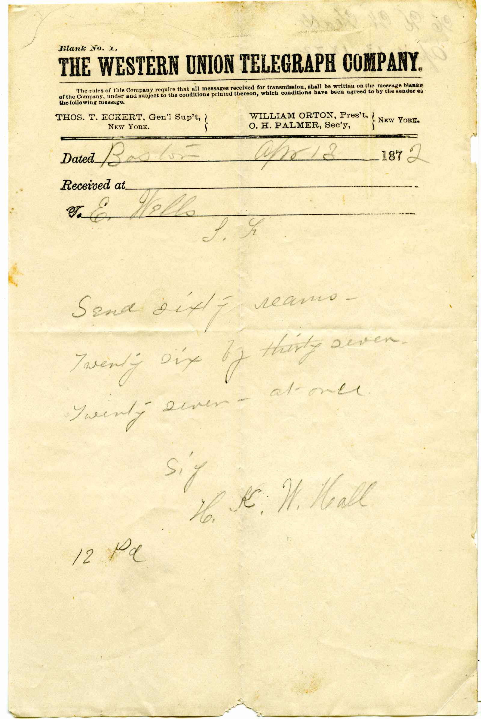 telegram; Hall, Henry K.W. - Paper & Twine Dealer - Boston