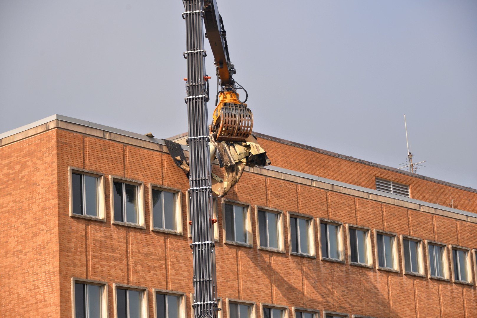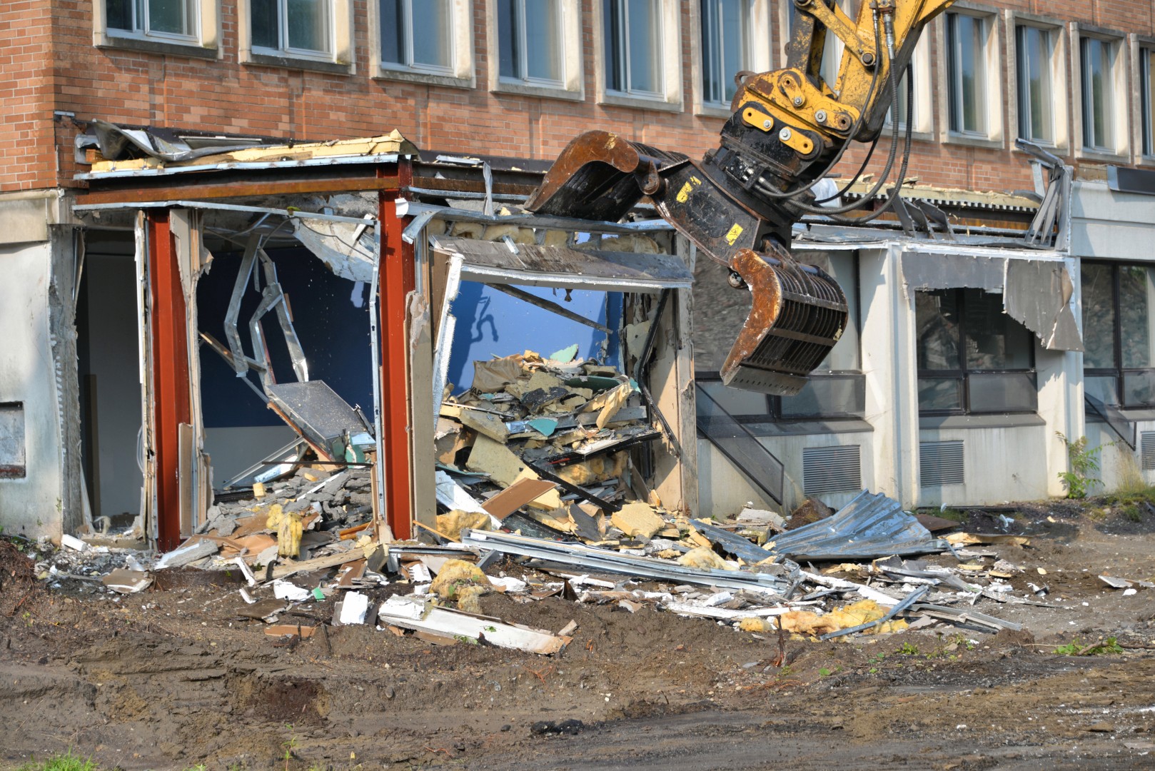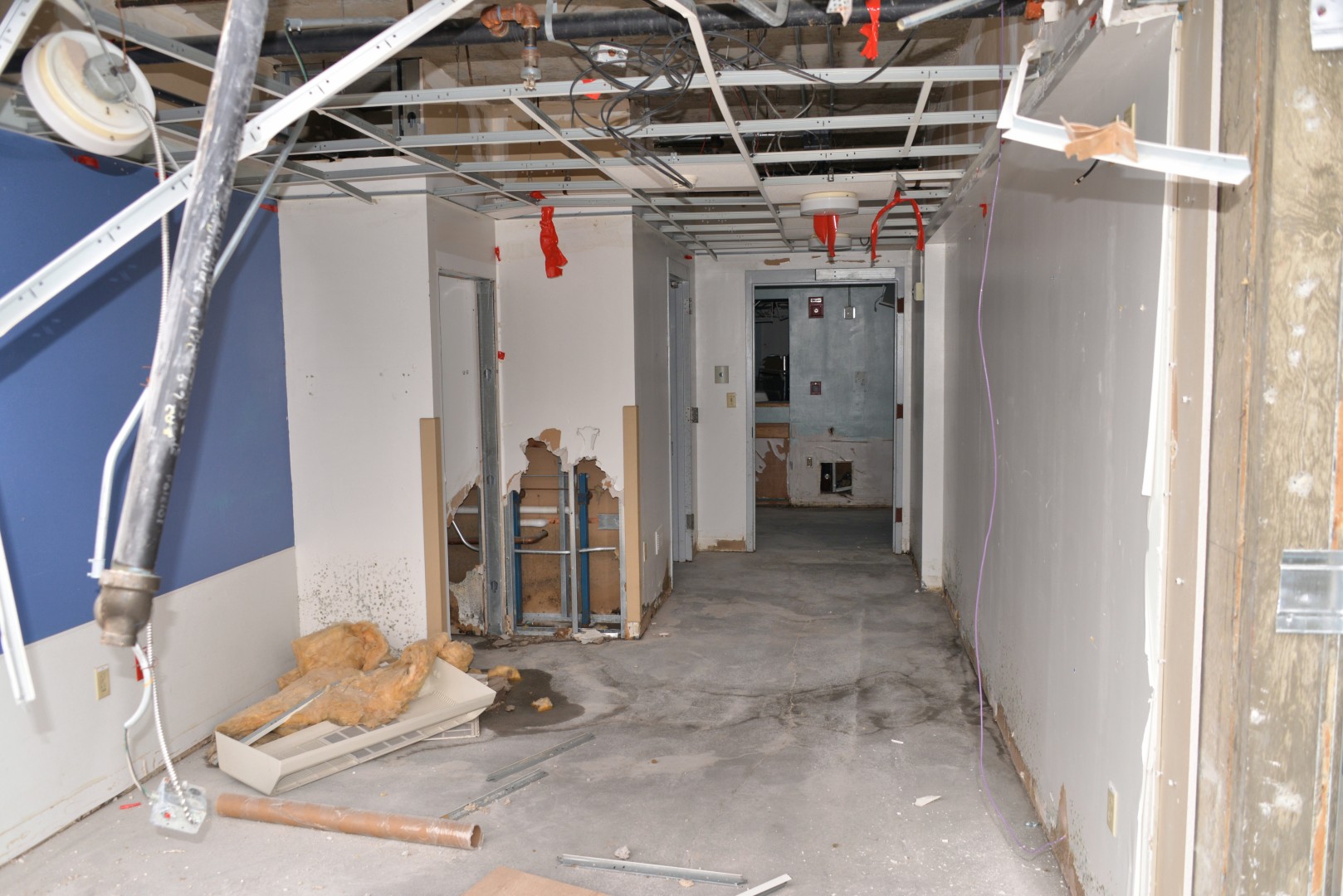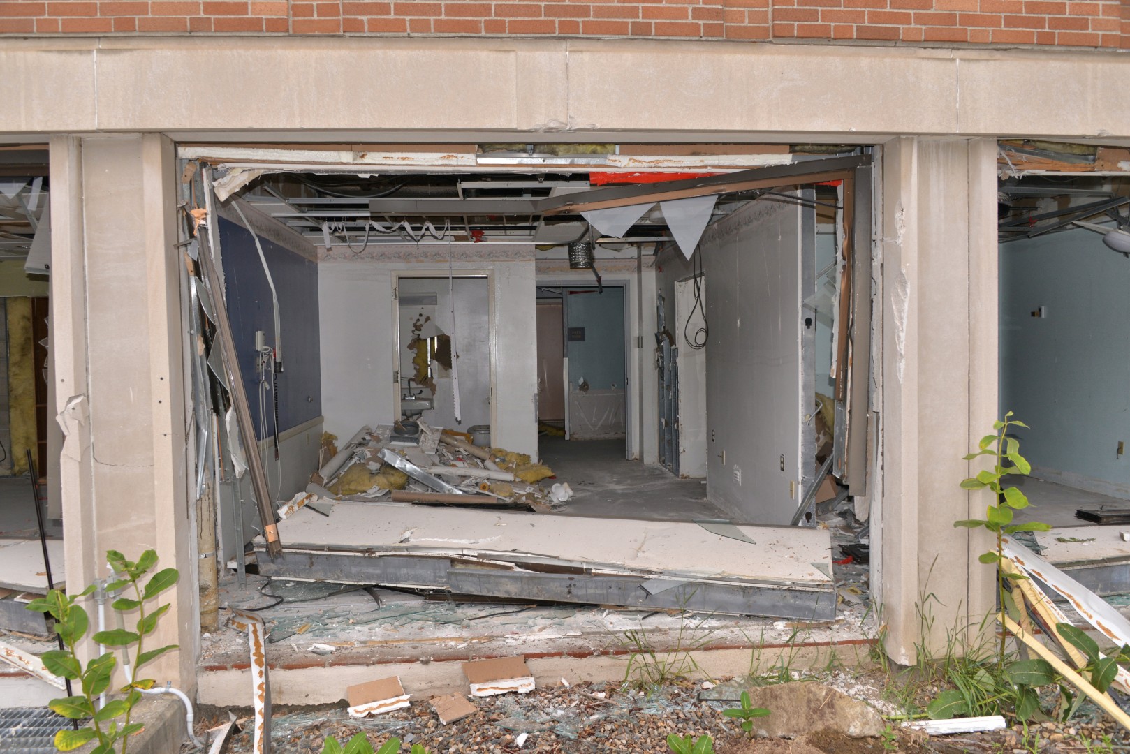 Removal of roof insulation and sections of a rubber membrane. Other demolition areas are shown.