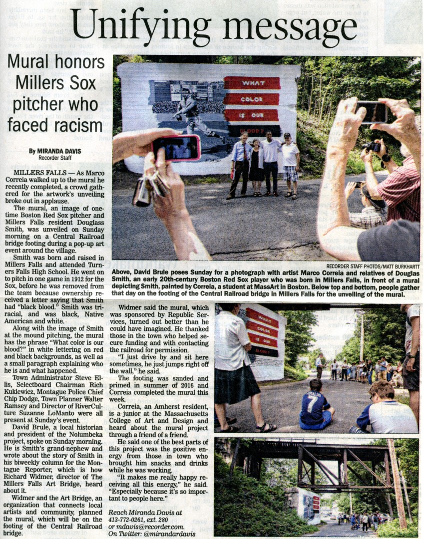 | dc.description | Douglass "Dug" Smith from Millers Falls, MA was a baseball pitcher of extraordinary talent. He pitched successfully for Turners Falls High School and was later signed to the Boston Red Sox. A wonderful seven-page article about him appears in the book "Opening Fenway Park with Style: The World champion 1912 Red Sox." by Bill Nowlin. During July of 2017 Artist Marco Corriea rendered a neat mural of "Dug" Smith on the stone abutment of the B&M RR bridge located on Franklin Street in Millers Falls, MA. Corriea captured the spirit of a local man who made it from the high school baseball ranks to the Boston "big league." A fitting tribute to Smith to be sure. | |
