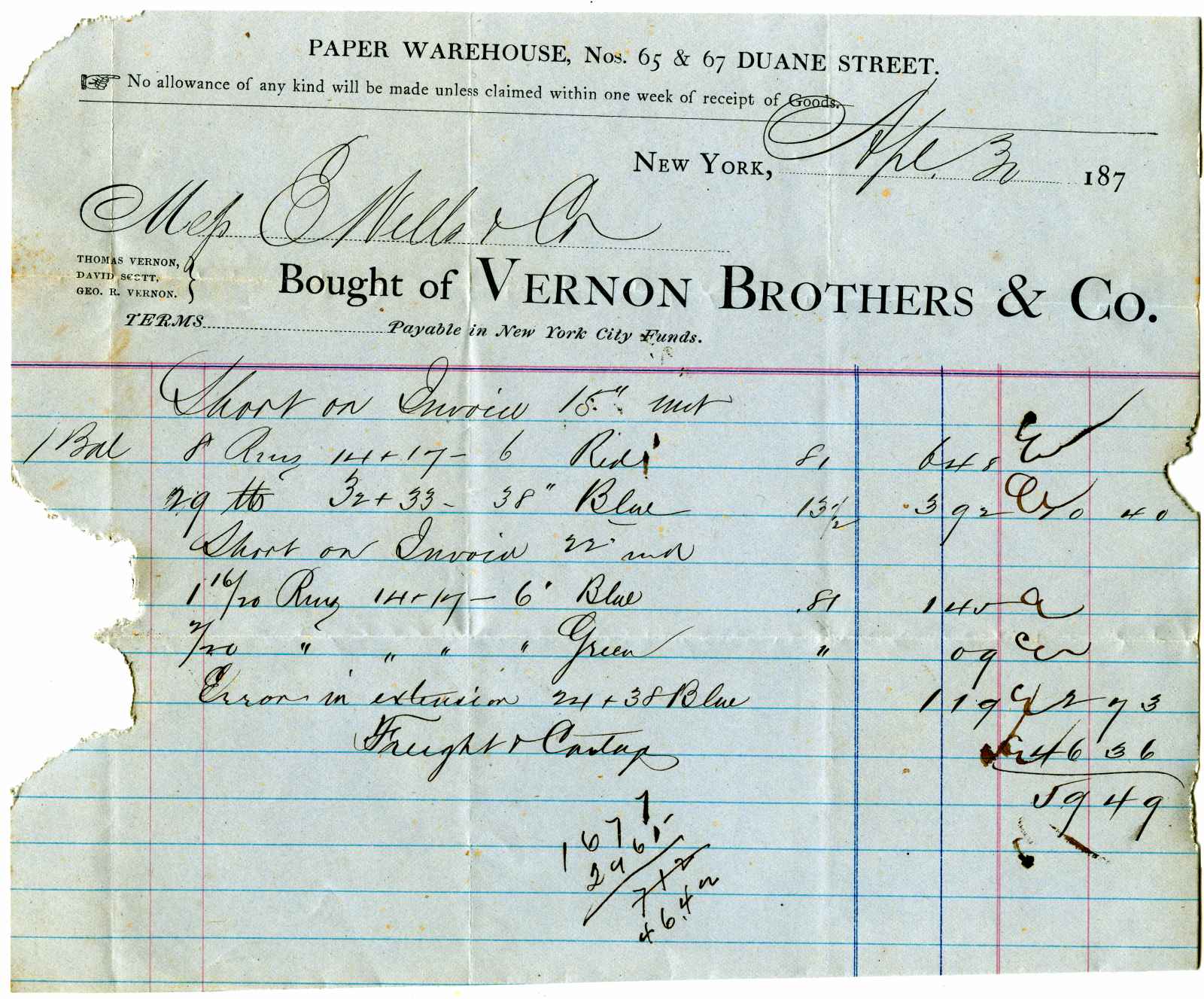 invoice; Vernon Brothers & Co. - Paper Warehouse - N.Y.