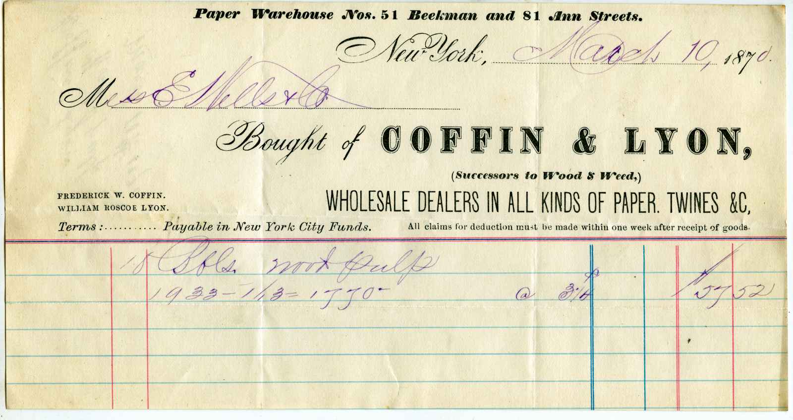 invoice; Coffin & Lyon - Wholesale Paper Warehouse - N. Y.
