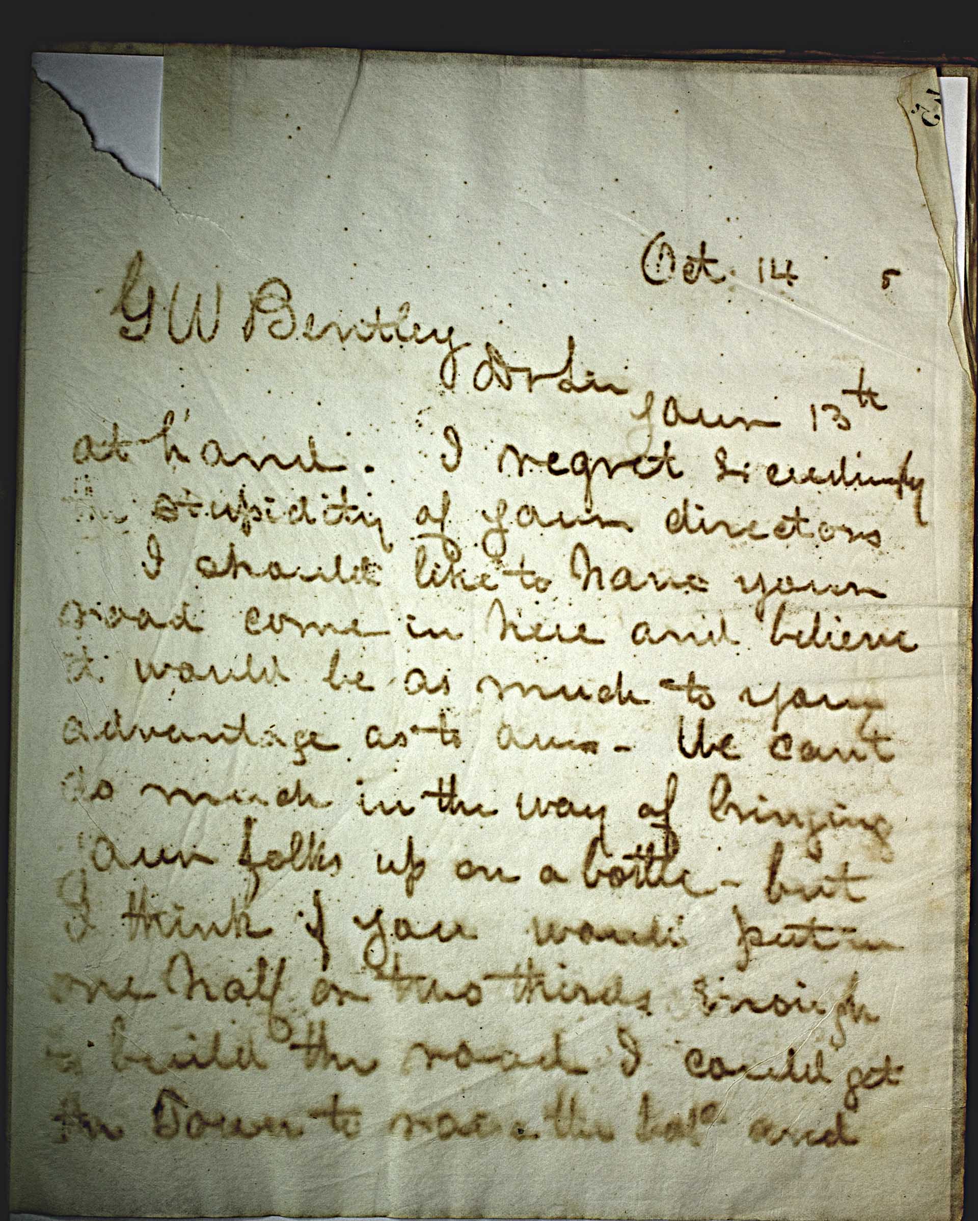 | dc.description | Oct 14 5 [1875] -- G W Bentley -- Dr Sir -- Your 13th at hand. I regret exceedingly the stupidity of your directors I should like to have your road come in here and believe it would be as much to your advantage as to ours – We can't do much in the way of bringing your folks up on a [cattle] - but I think if you would put in one half or two thirds enough to build the road I could get the town to raise the balance and -- | |
