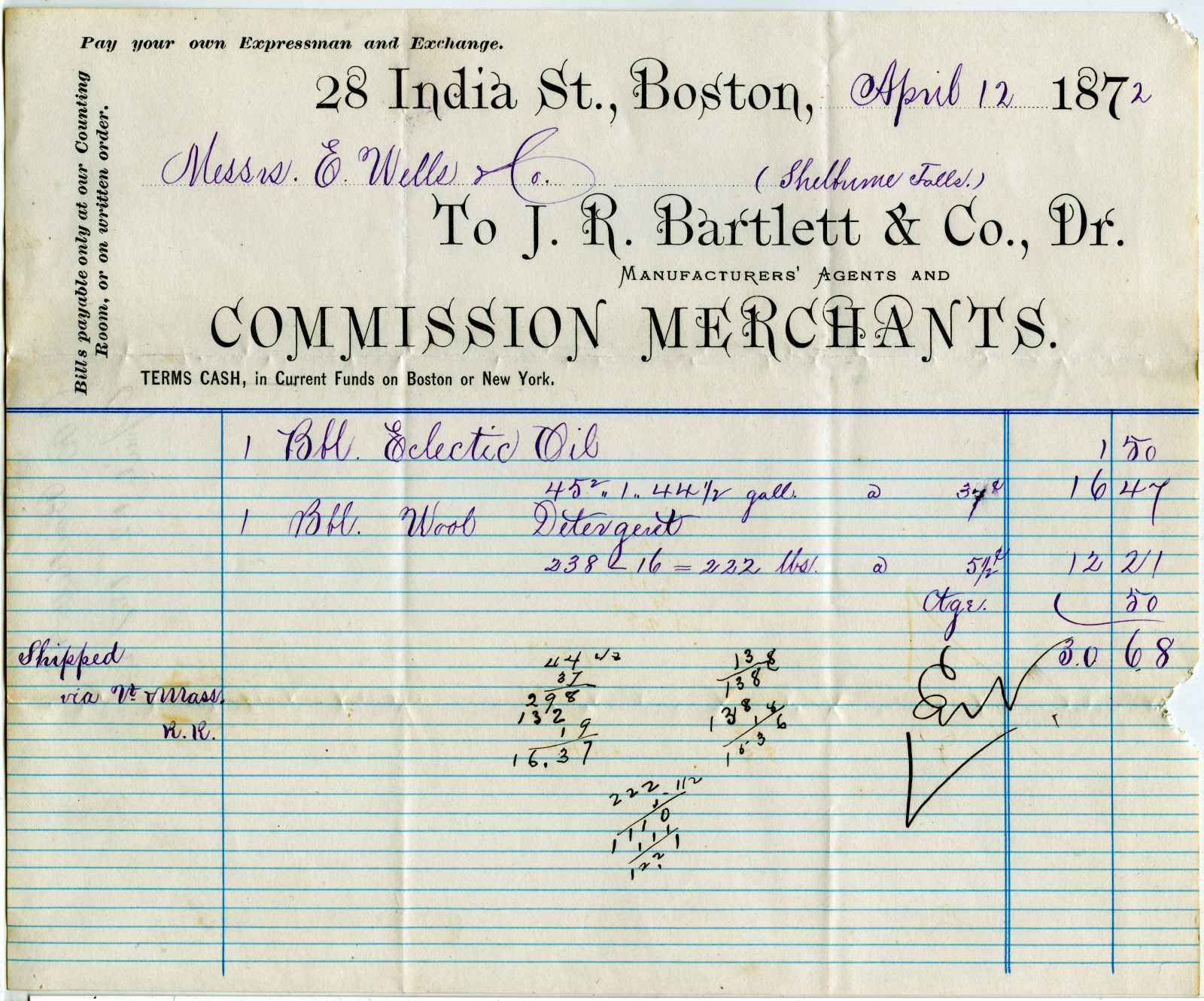 invoice; Bartlett, J. R. - Commission Merchants - Boston