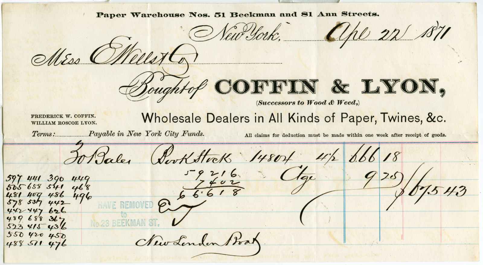 receipt; Coffin & Lyon - Wholesale Paper Warehouse - N.Y.