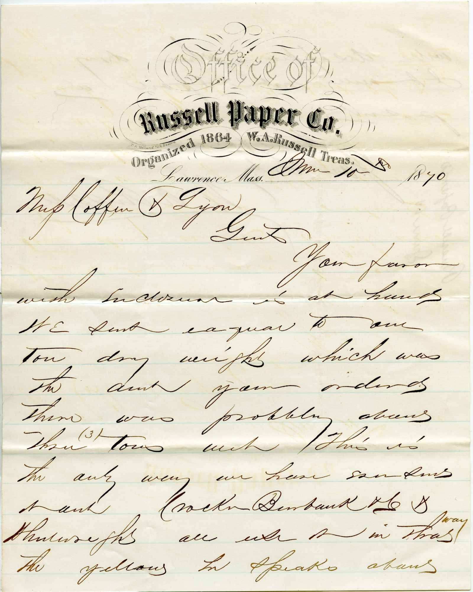 incoming correspondence to the papermaking company of Elisha Wells - circa 1870