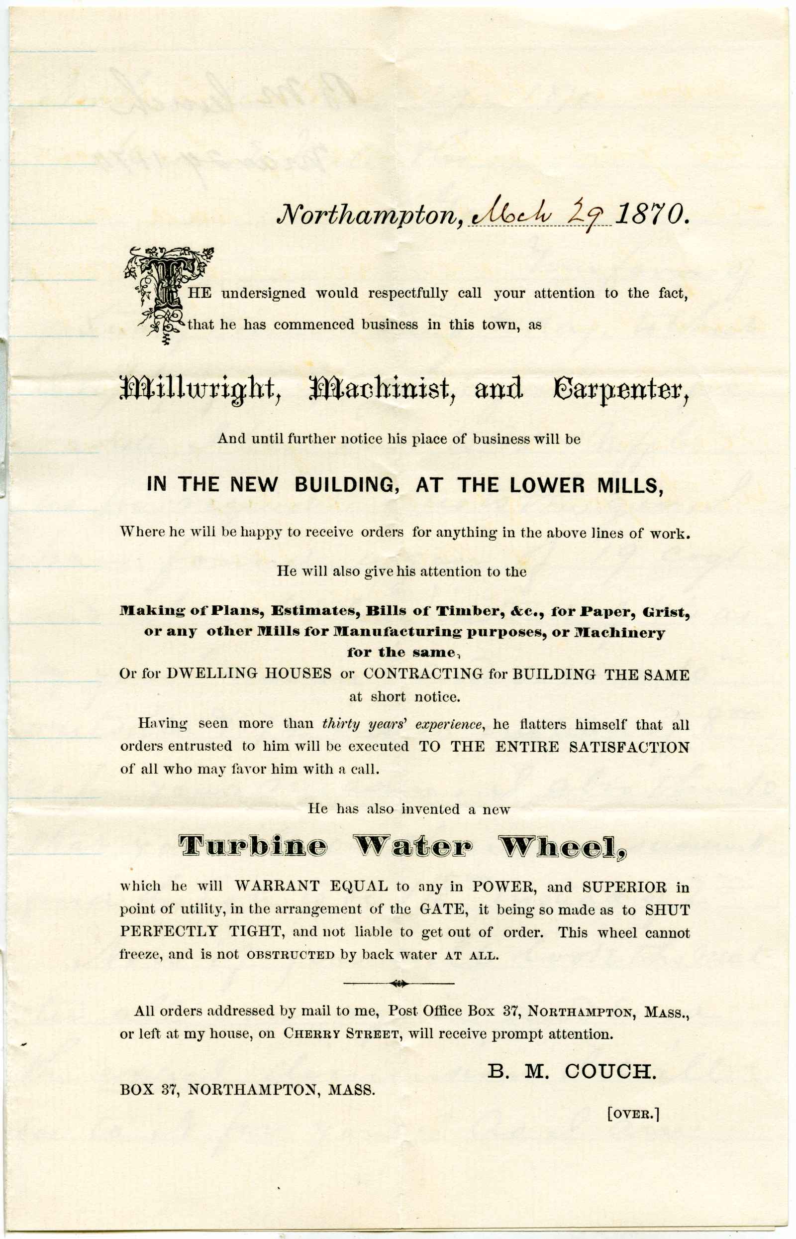 notice; Couch, B. M. - Millwright, Machinist, Carpenter - Northampton, Ma.