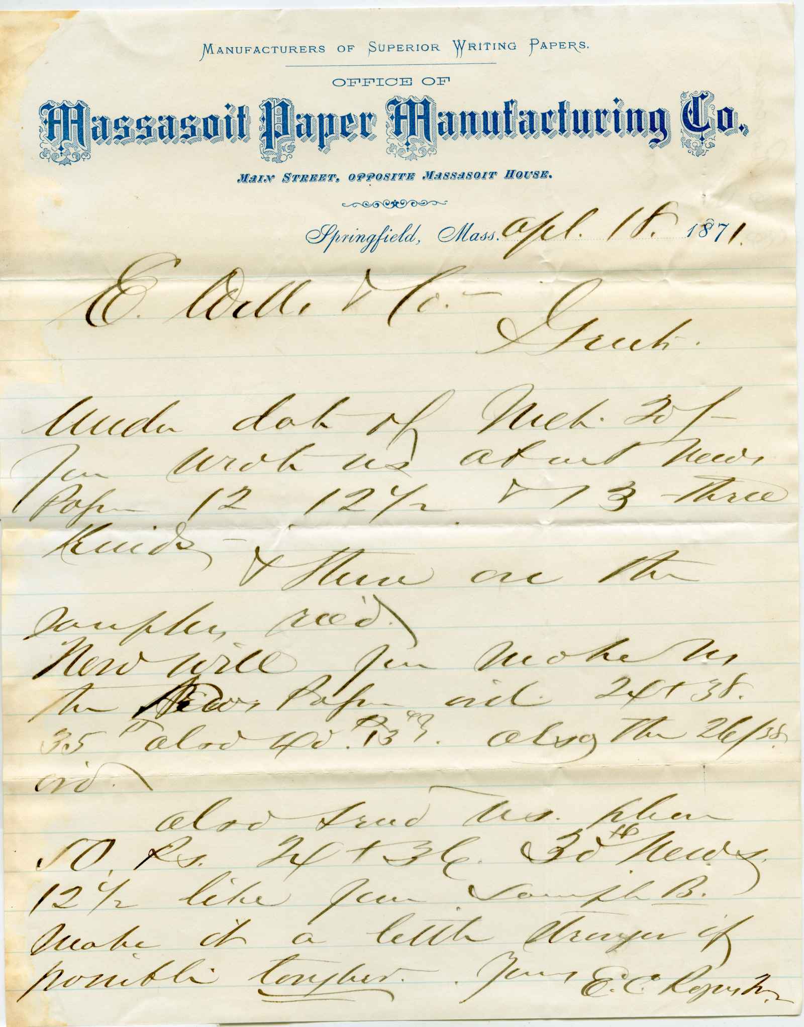 | dc.description.abstract | incoming correspondence to the papermaking company of Elisha Wells - circa 1870 | |