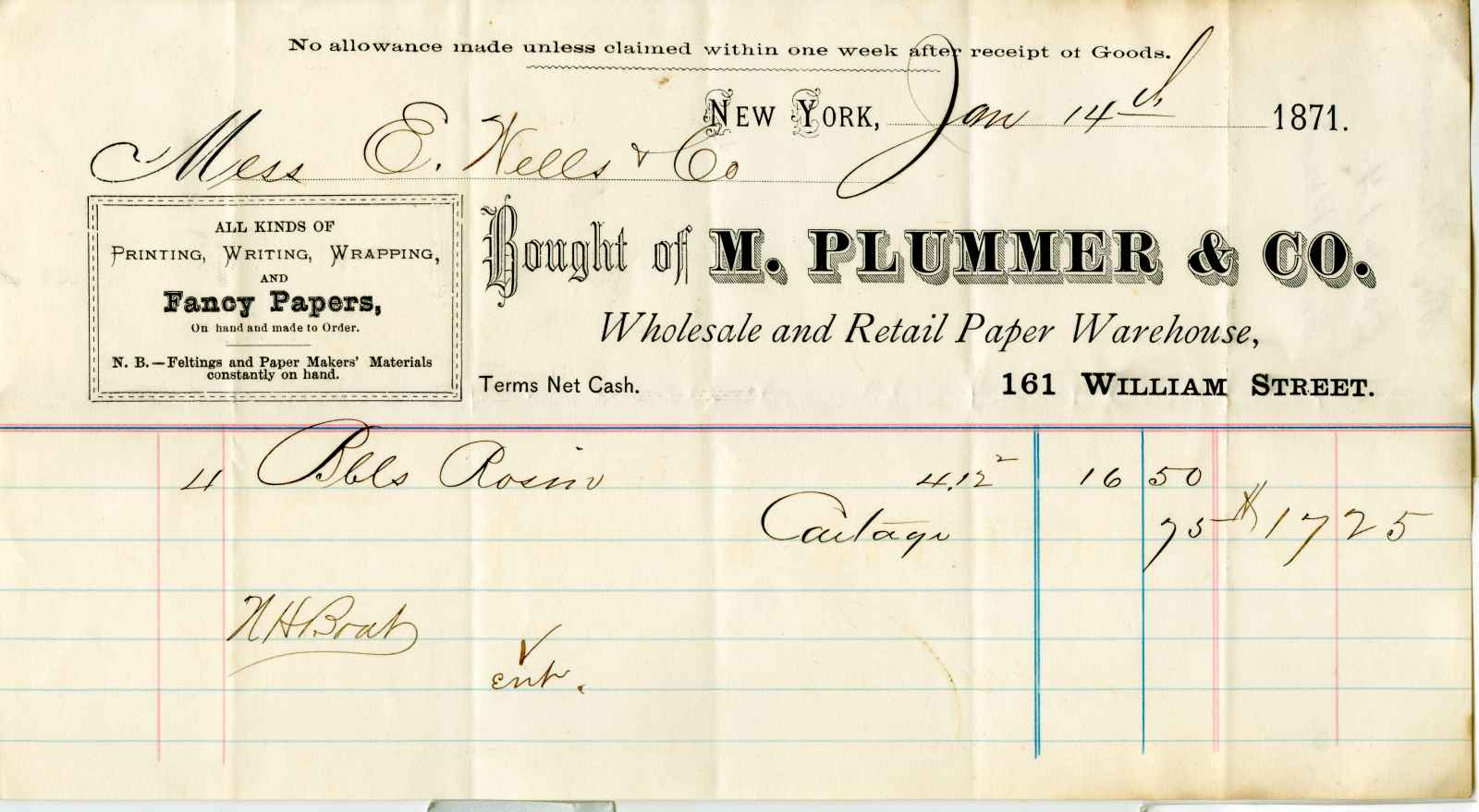 receipt; Plummer, M. & Co. - Wholesale & Retail paper Dealers - N.Y.